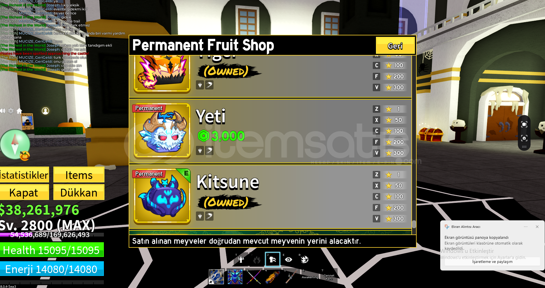 BloxFruit Permli Hesap Perm Dragon Ve Perm kit perm perm tiger(werewolf skinli) portal perm dough perm pain(celestial pain skini vardır) perm lightining (red lightining skini vardır) Perm dough ve 2x mastry 2x money, fast boat 2x drop changede bulunur satın almak isteyen dm gelebilir fruit notifer yoktur bilginizeangel v4 full geardraco v4 full gearghoul v4 full geartüm dövüş stilleri bulunmaktaKılıçlar ise:Cursed Dual KATANATrue Triple Katanah...