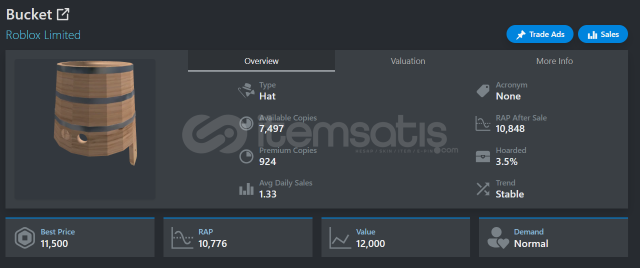İlanı Aldığınızda Bucket Limited Trade Yöntemi İle Teslim EdilirRolimons Sitesine Göre Value Değeri 12000 Robuxtur ve Demandı(Talebi) Normal Seviyesindedir Yani Biraz Uğraşarak Trade Edebilir Veya SatabilirsinizSize Teslimi Gerçekleştirebilmem İçin Hesabınızda Premium Ve Bir Adet Small Limited(UGC Olmayan 0-200 Robux Arası Herhangi Bir Limited) Bulunmalıdır600+ Başarılı...