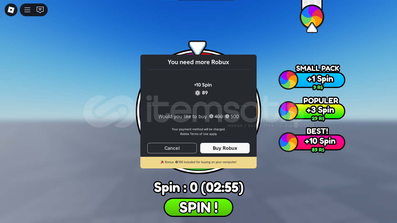 ⚡ Anında Teslimat: İlanı satın aldıktan sonra indirme linkiniz hemen iletilir.✨ Bu sistem ile Roblox oyununuza ödüllü bir çark çevirme mekaniği ekleyebilirsiniz.🛠️ Kurulum Gerektirmez: İndirdikten sonra tek tıkla kullanıma başlayabilirsiniz.🗂️ Dosya Türü: .rbxl (Roblox Studio oyun dosyası.)❗ Gelir elde etmek için GamePass ID’...