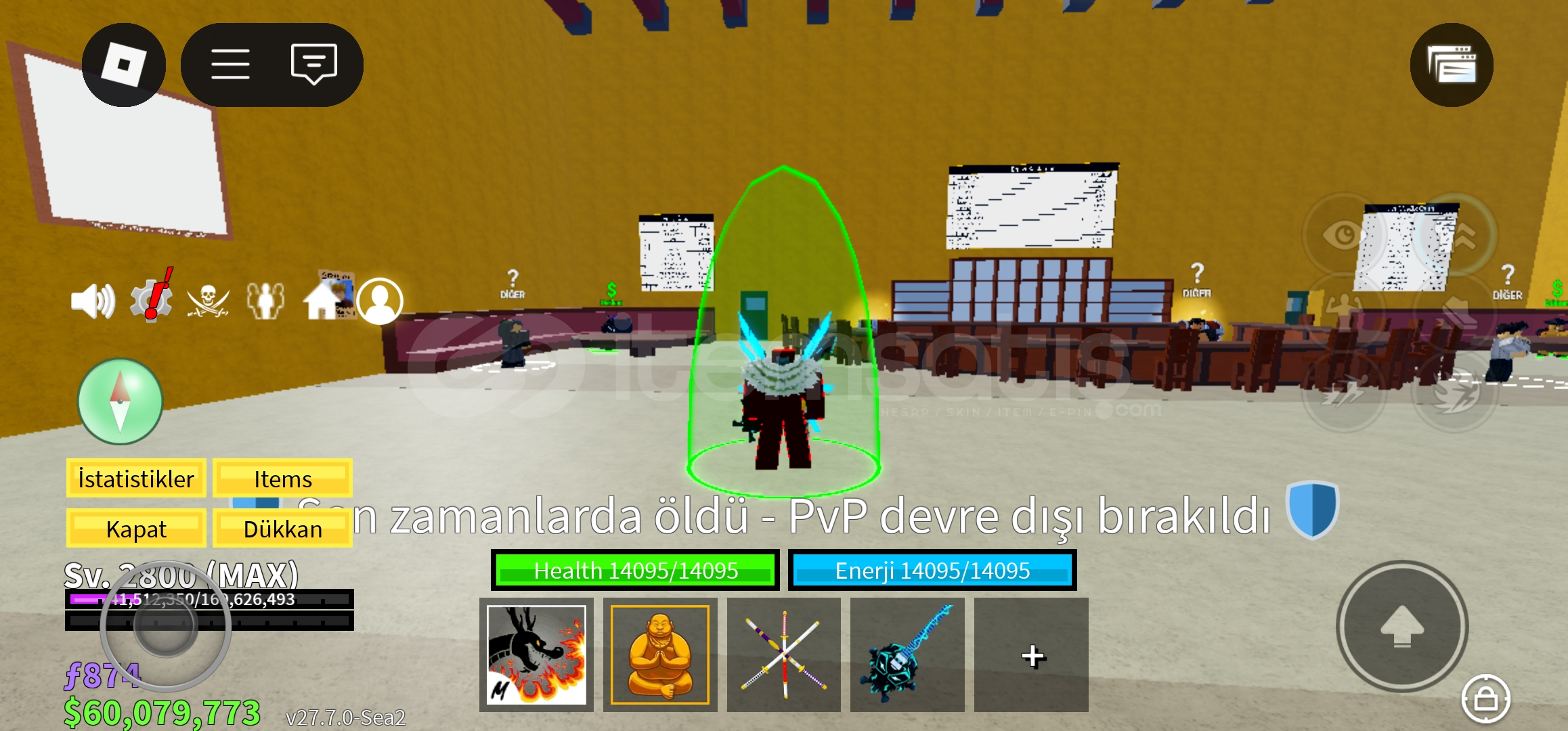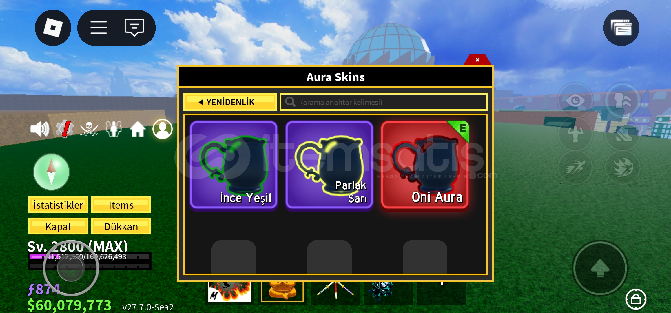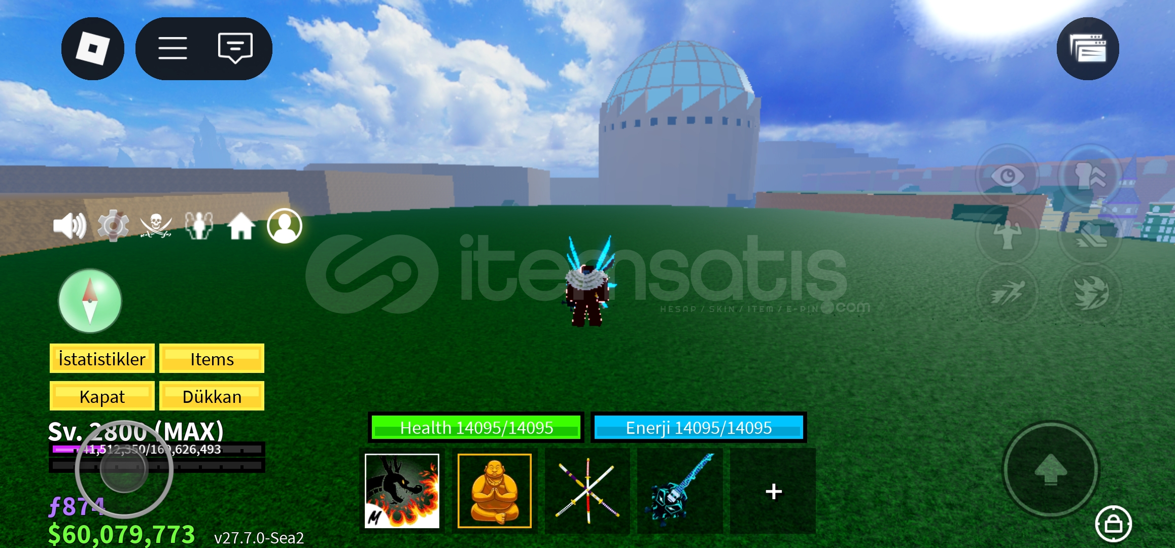 HESAPTA CDK VARDIR VE TTK VARDIR MAMOTH VE GRAVİTY VARDIR 60 MİLYON BELİ HAKİ MAX VE MİSTİK ONİ HAKİ VARDIR 1 TANE MİSTİK AKSESUAR VARDIR CYBORG V4 DÜR BİR ÇOK KILIÇ BULUNMAKTADIR 3 RENK HAKİ RENGİ VARDIR SKULL (SOUL) GİTAR BULUNMAKTADIR HESAPTA GMAİL VE NO ÇALINMA İHTİMALİNE KARŞI VARDIR ALINDIGINDA İKİSİDE DEGİŞTİRİLCEKTİR