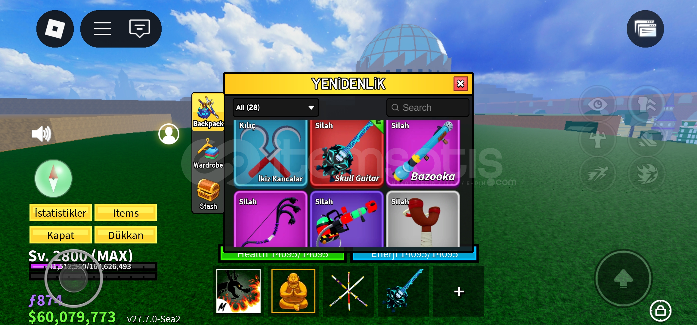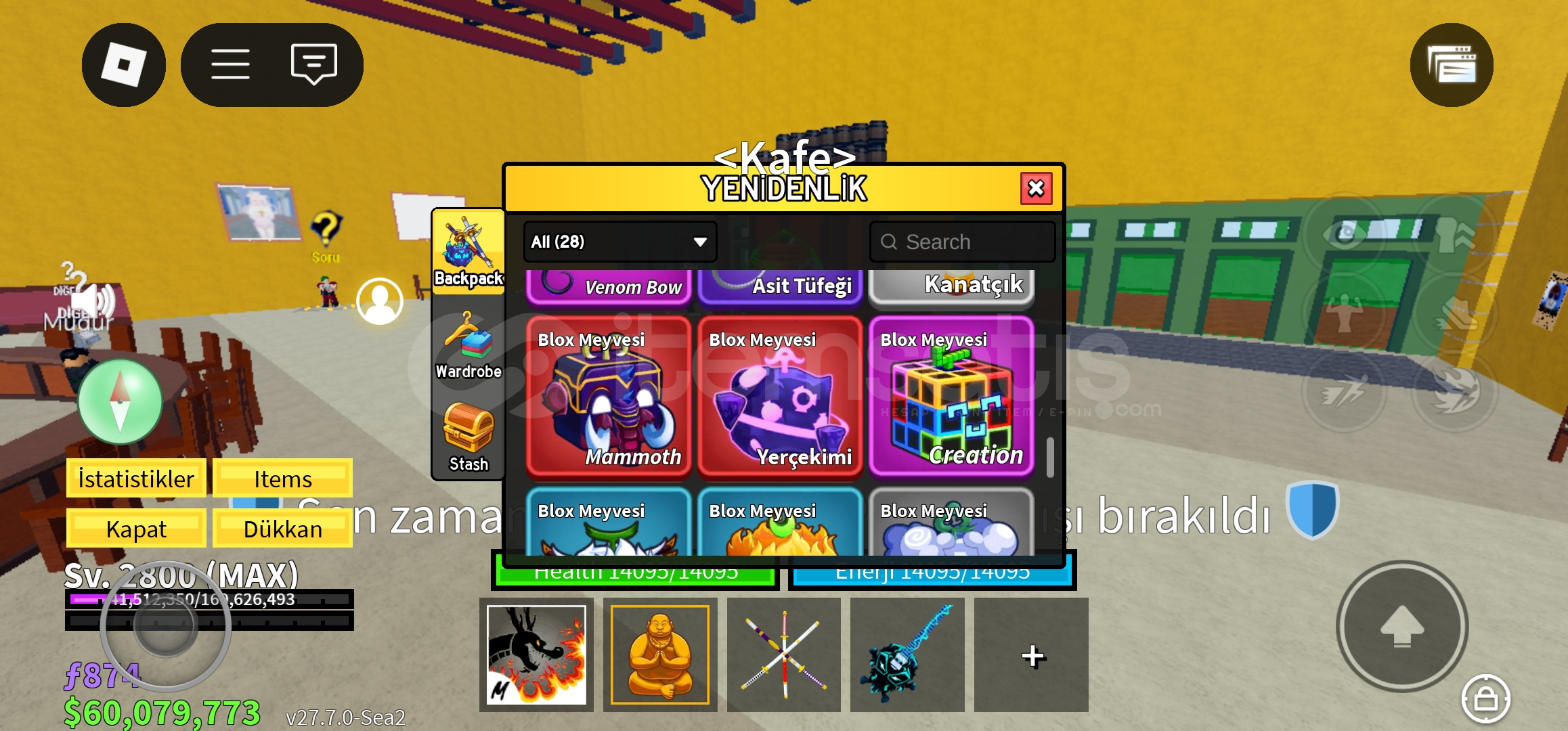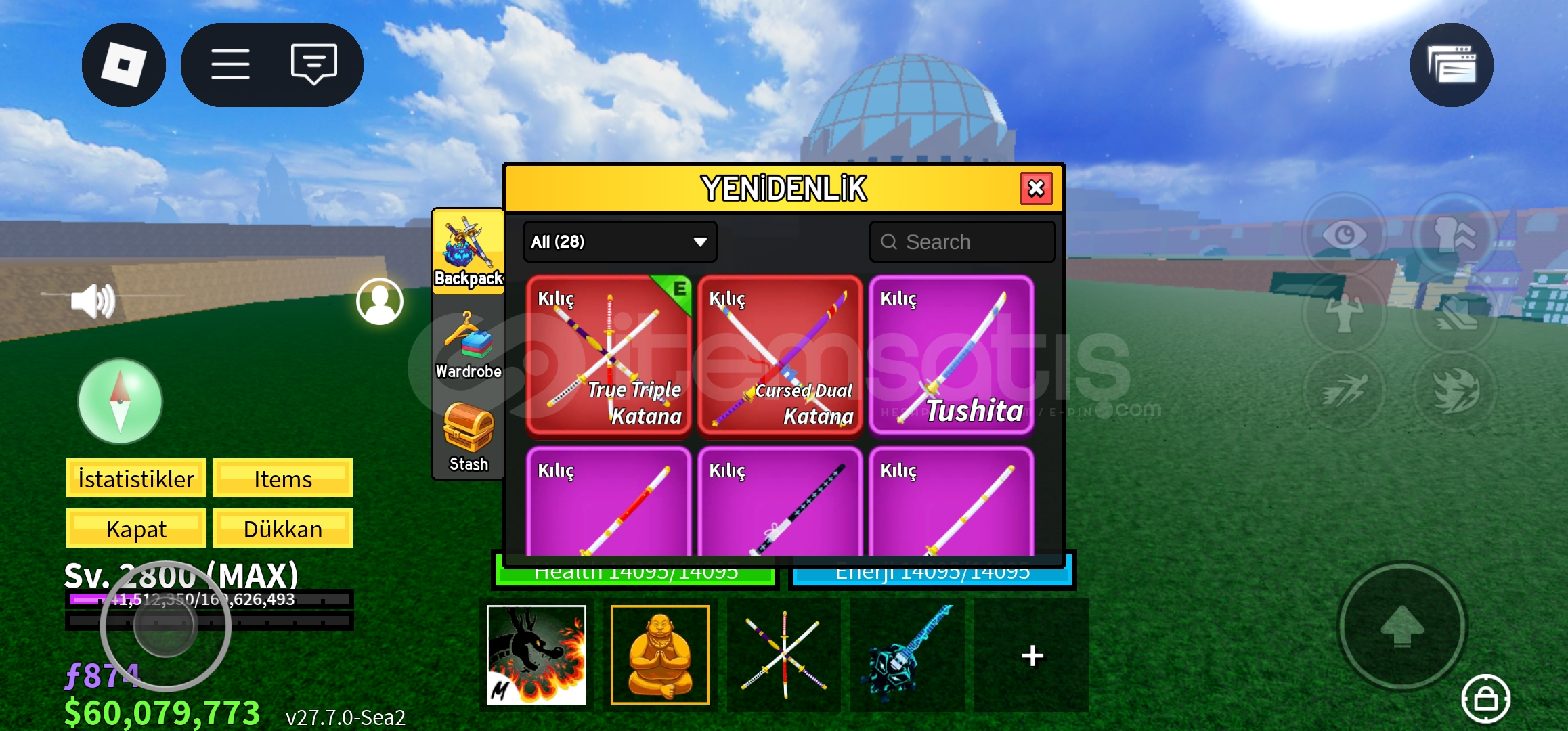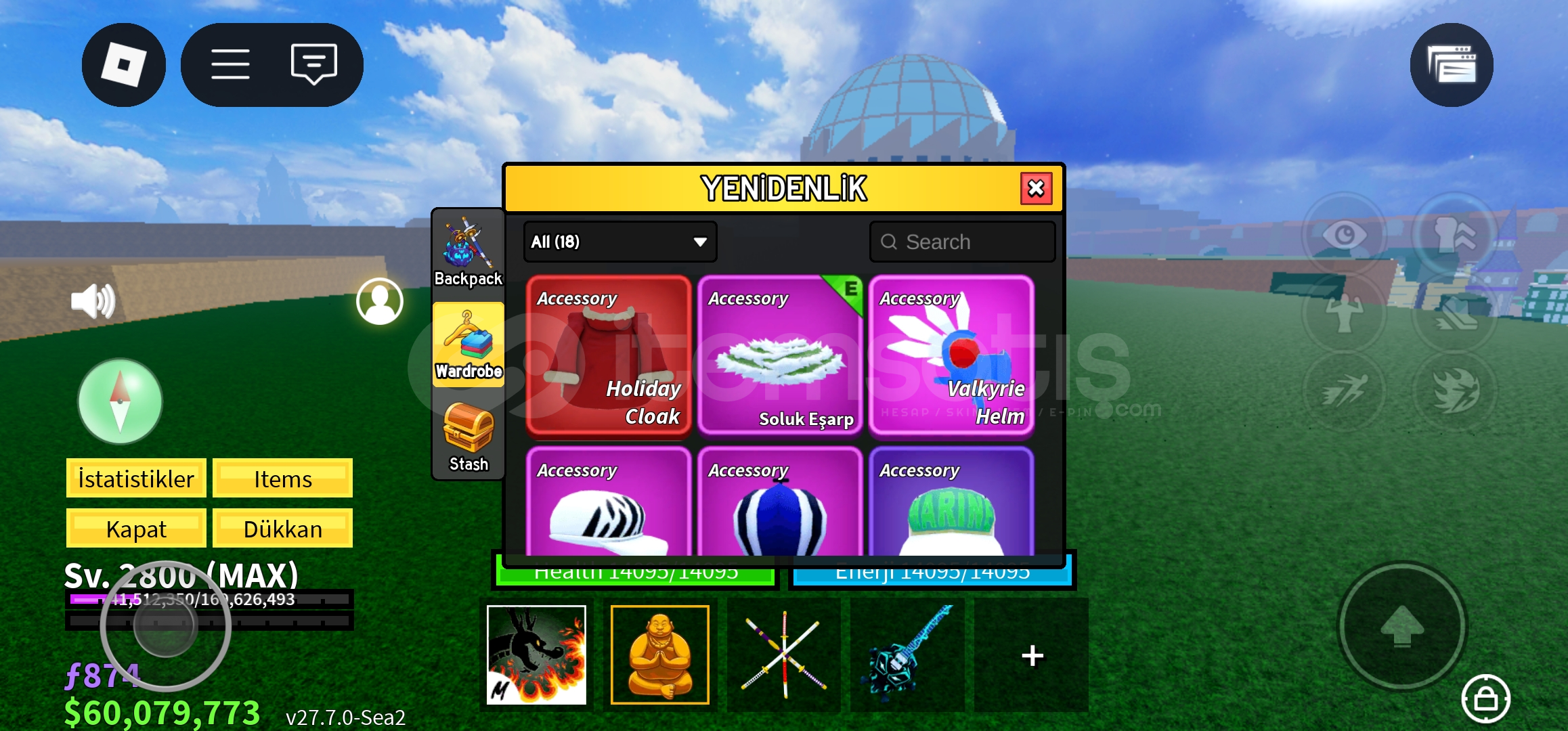 HESAPTA CDK VARDIR VE TTK VARDIR MAMOTH VE GRAVİTY VARDIR 60 MİLYON BELİ HAKİ MAX VE MİSTİK ONİ HAKİ VARDIR 1 TANE MİSTİK AKSESUAR VARDIR CYBORG V4 DÜR BİR ÇOK KILIÇ BULUNMAKTADIR 3 RENK HAKİ RENGİ VARDIR SKULL (SOUL) GİTAR BULUNMAKTADIR HESAPTA GMAİL VE NO ÇALINMA İHTİMALİNE KARŞI VARDIR ALINDIGINDA İKİSİDE DEGİŞTİRİLCEKTİR