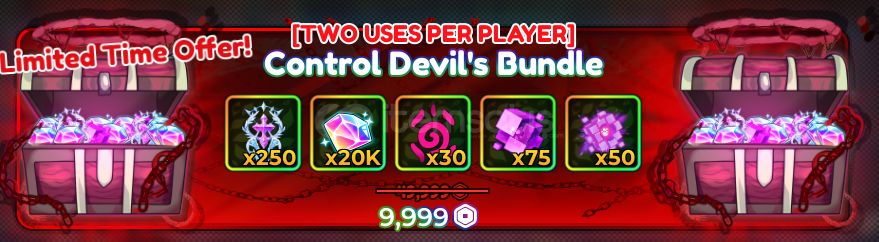 Anime Crusadersda Control Devil's Bundle Giftlencektir.----Paketin içinde:250 Divine Token20k Gem30 Curse Token75 Stat Cube ve50 Perfect Stat Cube vardır----Level farketmiyor.Oyun içi verilecektir.