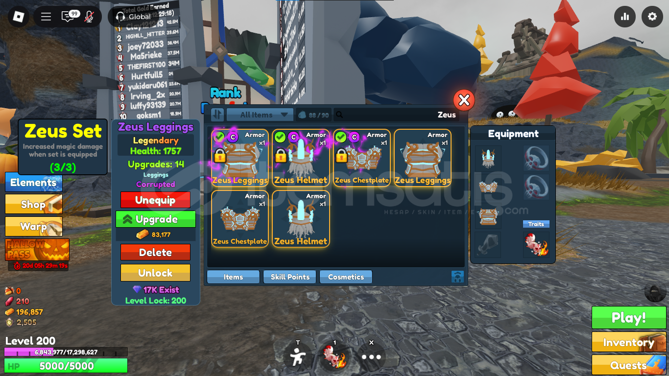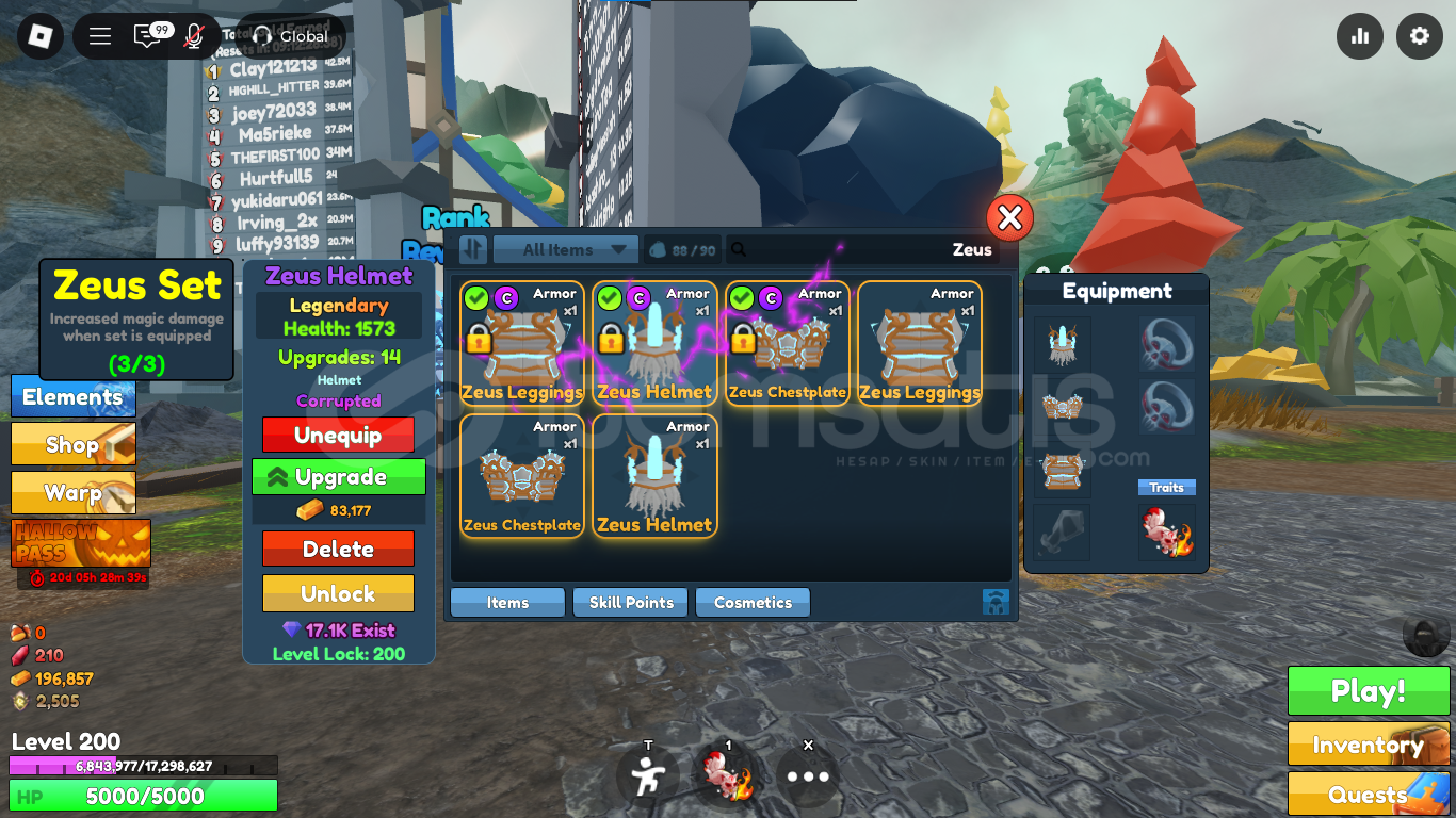 🔥 Set İçeriği:├─ C. Zeus Helmet → 1573 HP├─ C. Zeus Chestplate → 1569 HP└─ C. Zeus Leggings → 1757 HP❤️ Toplam HP: 4899💎 Nadirlik: Legendary⏱️ 17:00-24:00 saatleri arasında verilen siparişler daha hızlı teslim edilir.