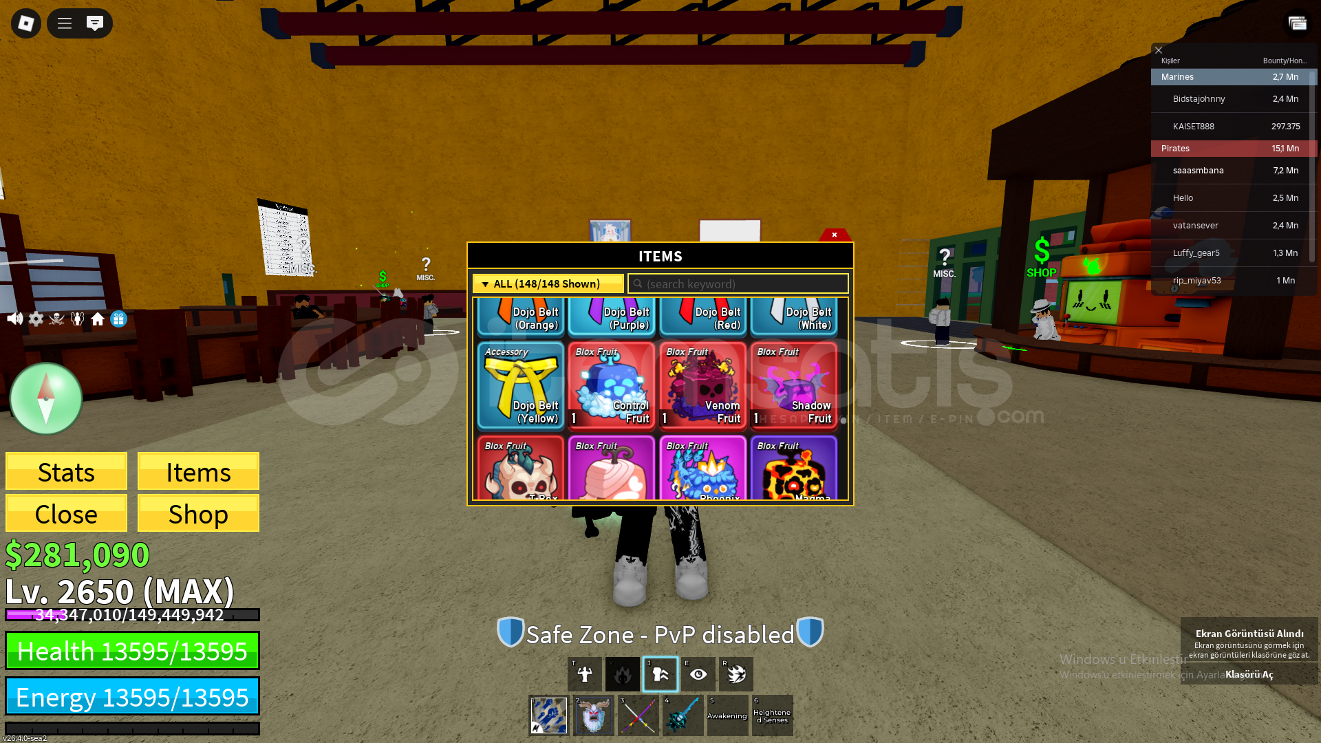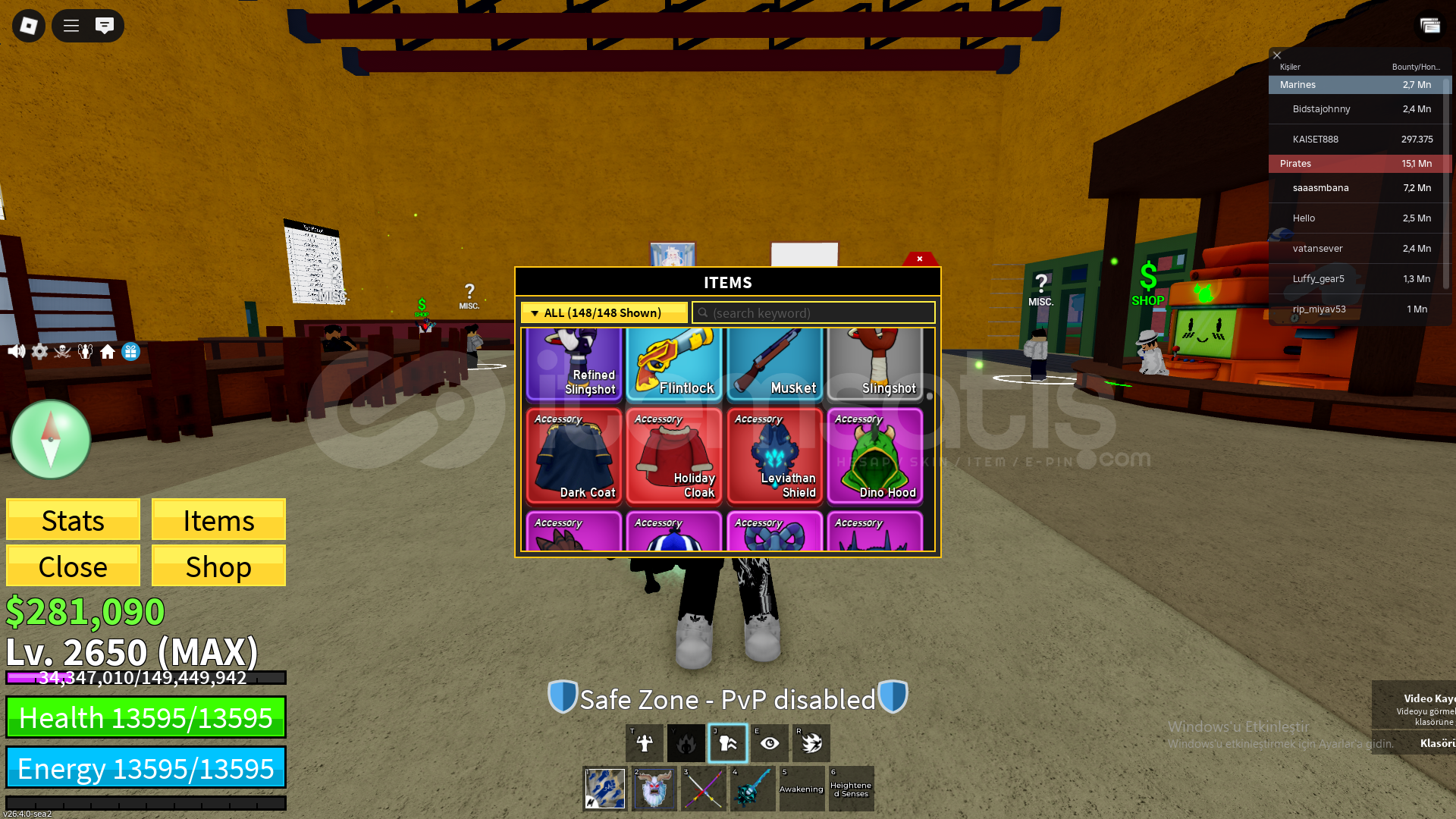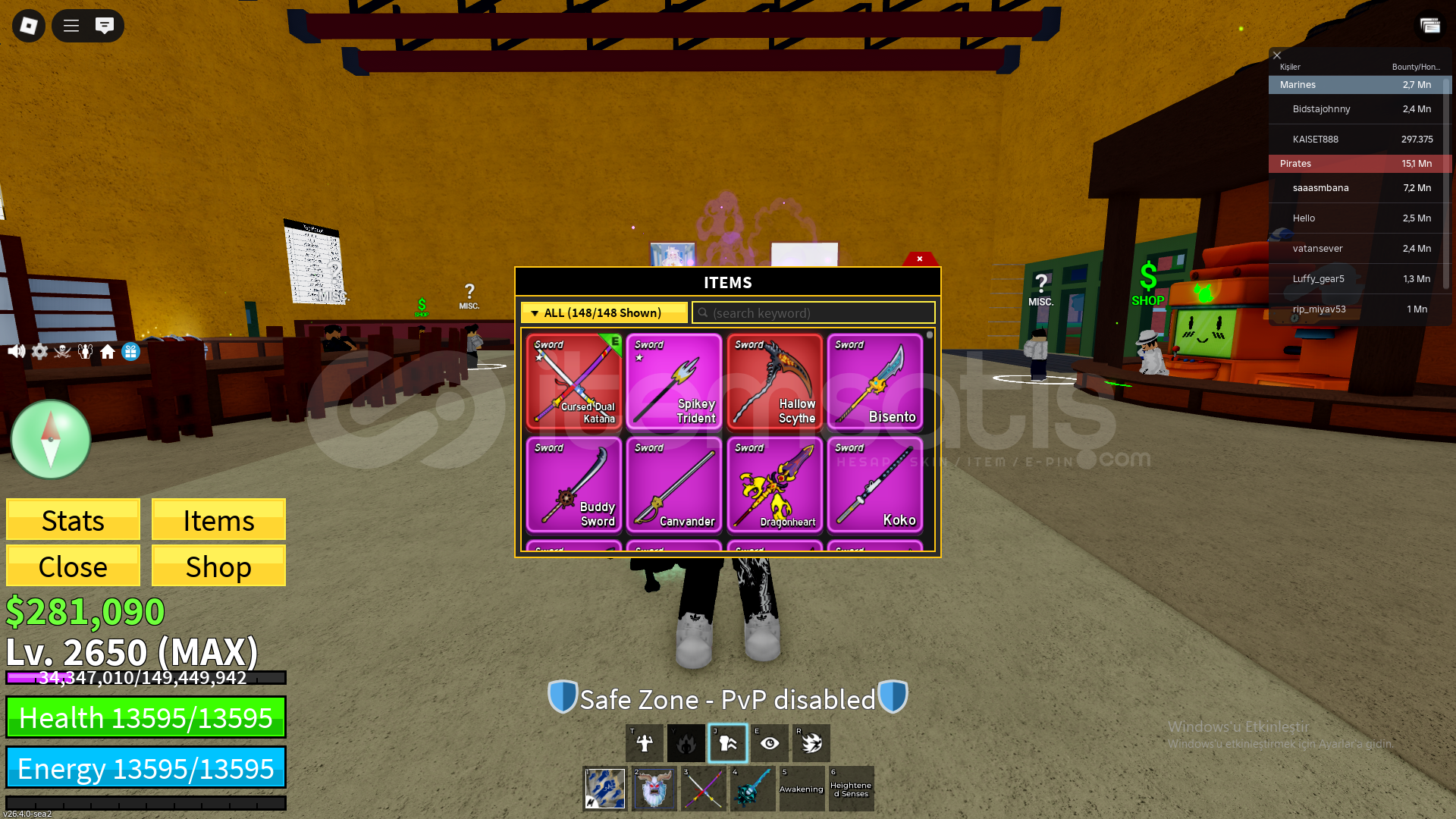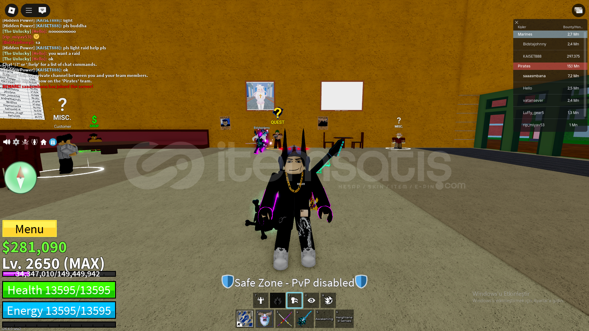 Hesap 2650 Level Hesapta Cdk Hallow Scythe Shark Anchor gibi Swordlar var Oyundaki Bütün dövüş stilleri var sanguine art dahil Dark Coat Holiday Cloak Leviathan Shield gibi çok nadir aksesuarlar bulunmakta 2x boos drop chance ve 2x mastery var hesapta Shark V4 Angel v4 Ghoul v4 draco v3 Yeti Kullanıyor 7.3M Bountysi bulunmakta Mainlemelik bir hesap.