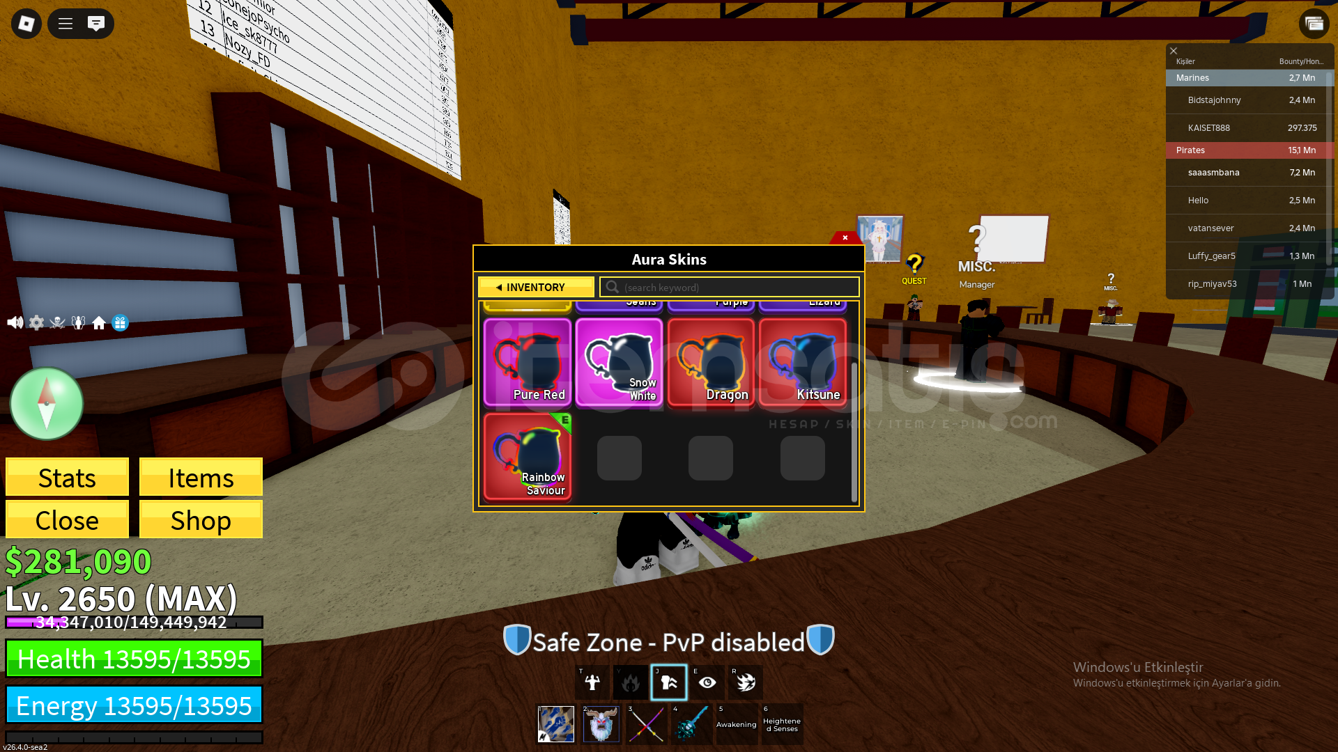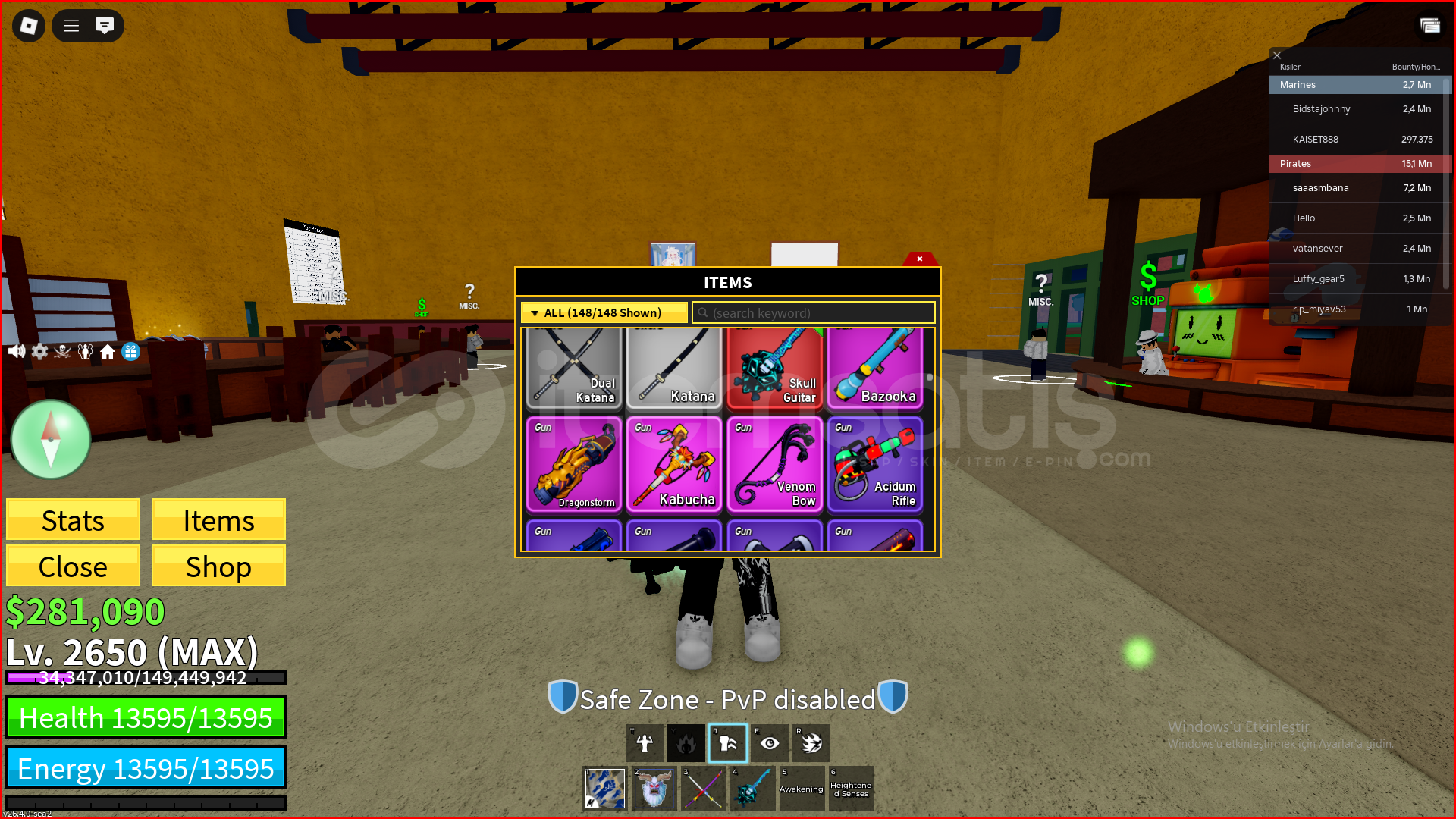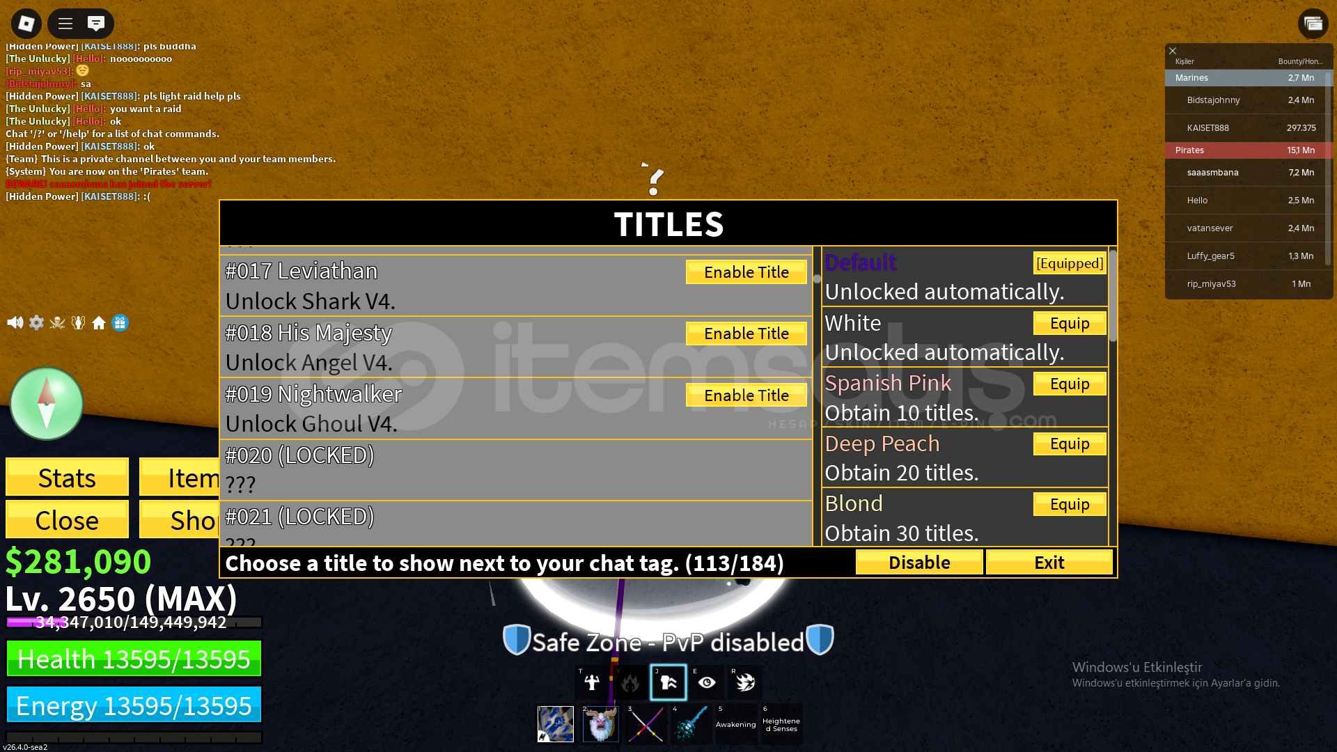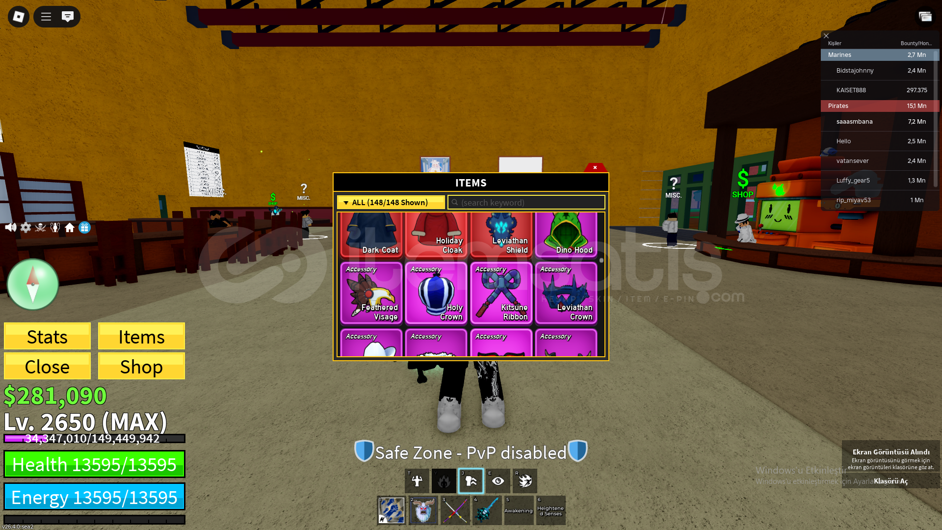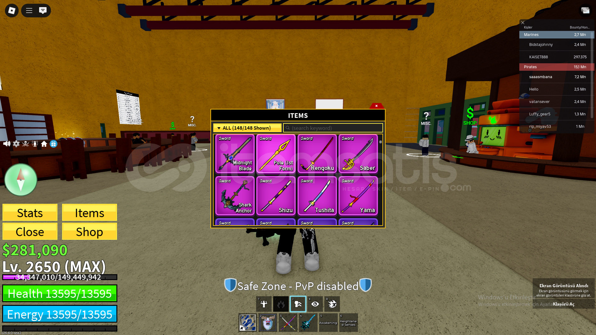 Hesap 2650 Level Hesapta Cdk Hallow Scythe Shark Anchor gibi Swordlar var Oyundaki Bütün dövüş stilleri var sanguine art dahil Dark Coat Holiday Cloak Leviathan Shield gibi çok nadir aksesuarlar bulunmakta 2x boos drop chance ve 2x mastery var hesapta Shark V4 Angel v4 Ghoul v4 draco v3 Yeti Kullanıyor 7.3M Bountysi bulunmakta Mainlemelik bir hesap.
