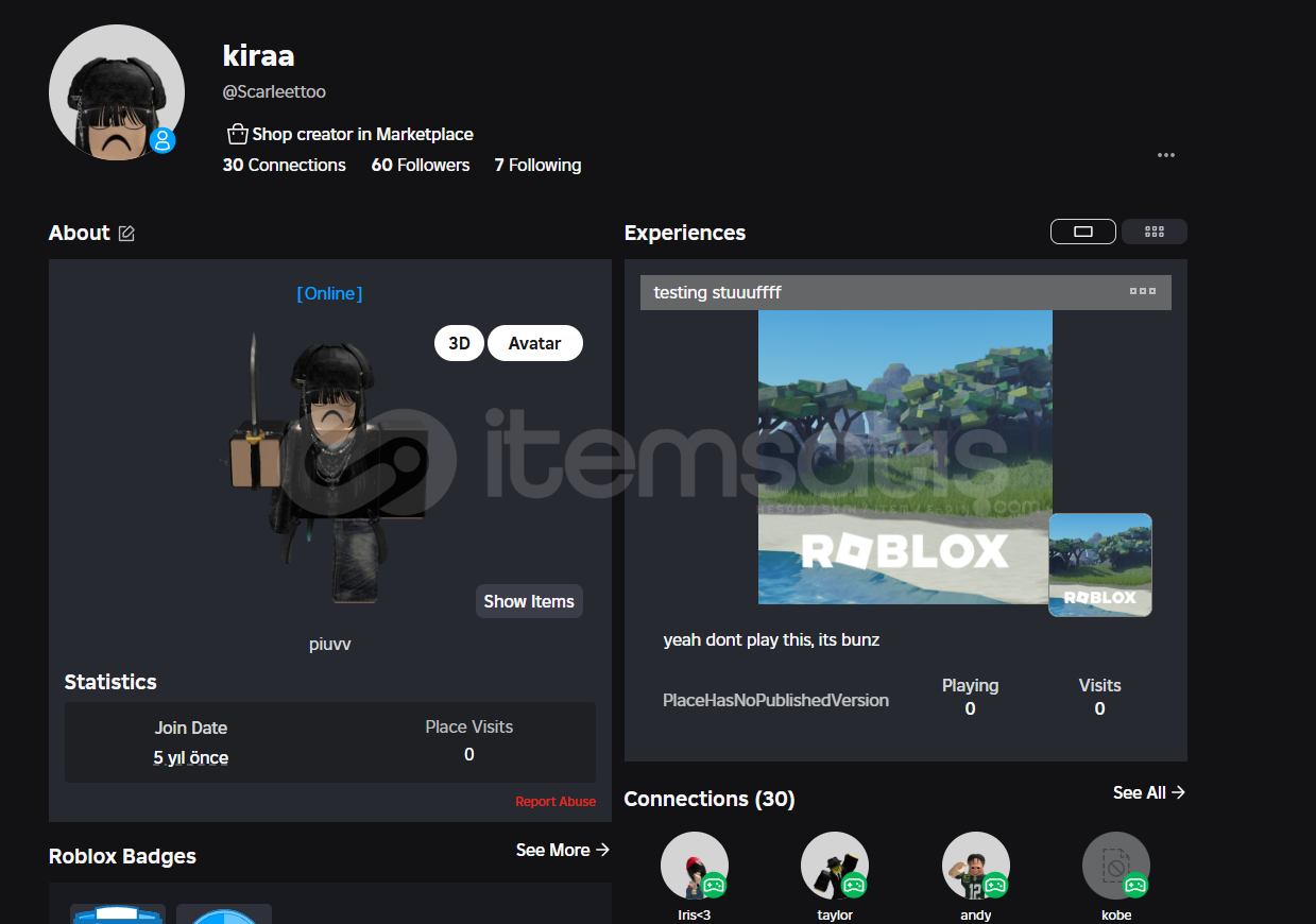 Hesabın ismi Scarleettoo envanteri açıktır bakabilirsiniz.Hesapta dolu aksesuar saç vb item vardır.Mail ile birlikte verilir.Hesapta 255 robux bulunmaktadır.Alana şimdiden hayırlı olsun!!