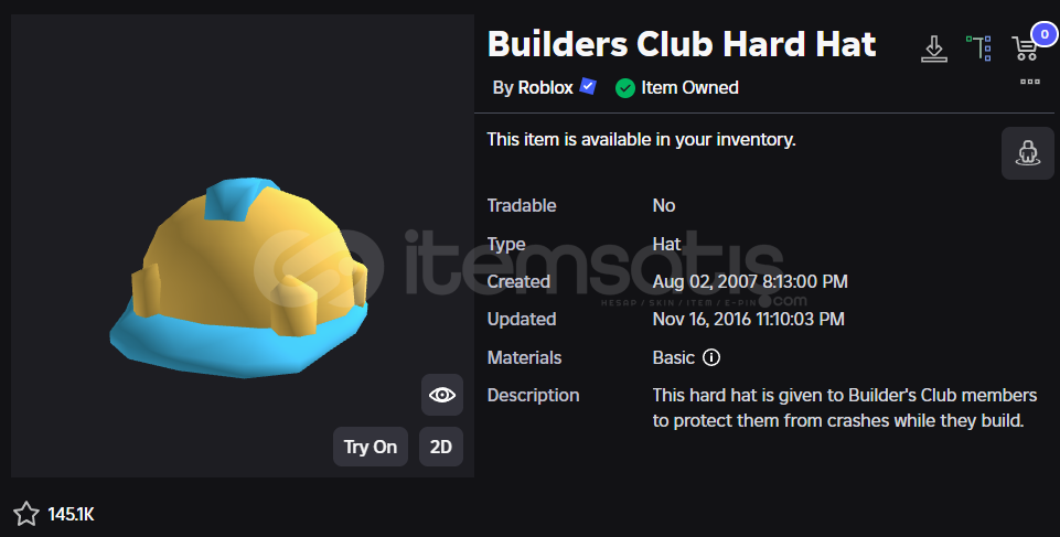 〆 Builders Club Hard Hat Şapkası Eski Yıllarda Premium Yerine Satın Alınabilen Abonelik Olan Builders Club Alanlara Özel Veriliyordu.
