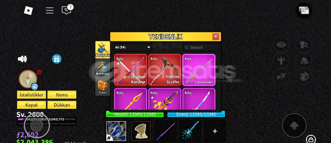 Hesap dolu dolu avatarlar gayet güzel brookhavende neredeyse tüm gamepasslar bulunuyor bloxfruit 2600 LVL cdk var bu fiyata bedava
