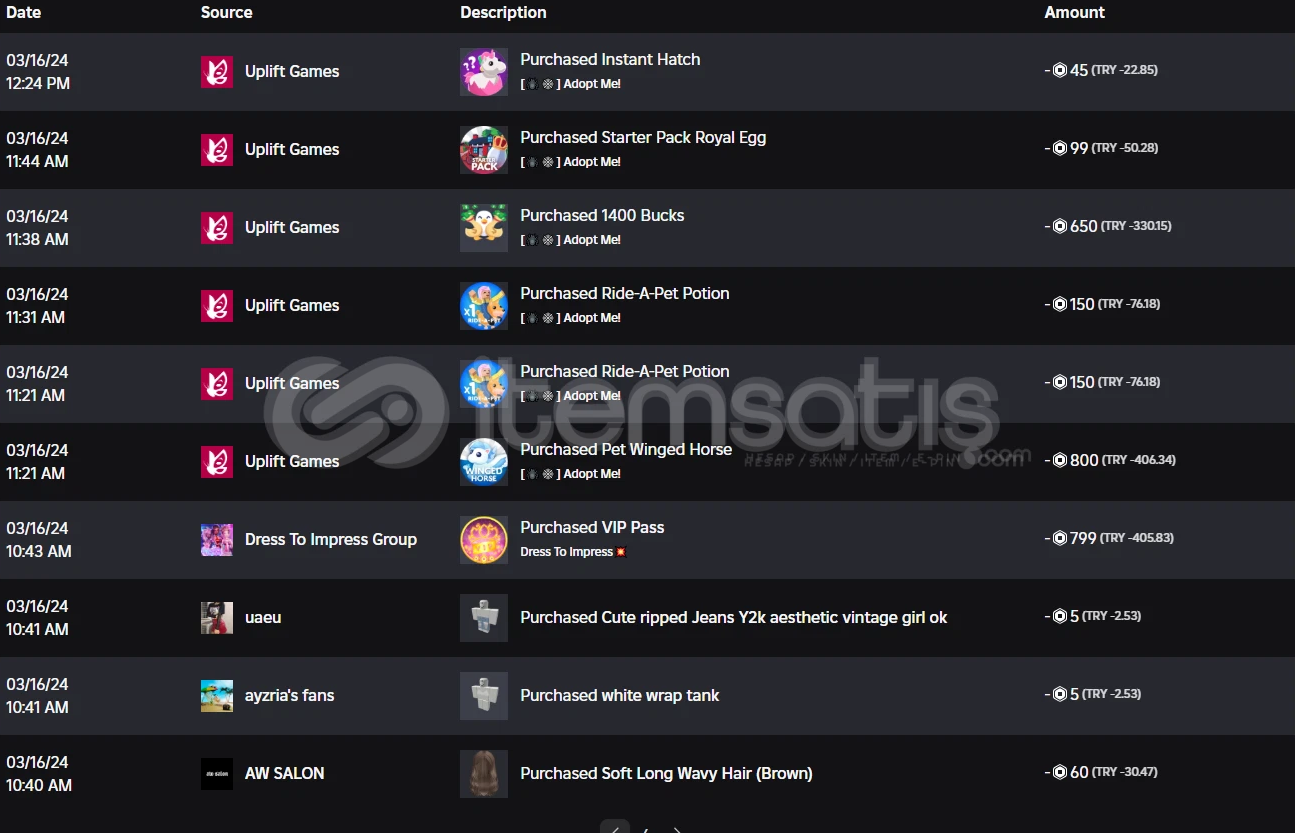 • Hesapta Genellikle Adopt Me, Zombie Attack, Restaurant Tycoon, BrookHaven, Horse Valley, Welcome To BloxBurg ve Dress To Impress gibi oyunlar oynanmıştır fakat bu oyunlardan sadece 'Dress To Impress'e GamePass alınmıştır. Diğer Robux harcamaları ise avatarlara gitmiştir.
