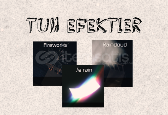 Efektler oyun parası ile alınmaktadırTanesi yerine hepsi 10TL yanına e rain hediyeİsteğe özel set halinde satış yapılmaktadırTrade yoluyla vip serverda teslim edilecektirTeşekkür ederiz :)