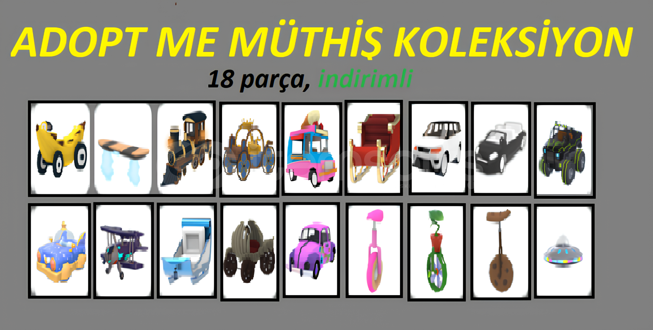 Önemli not: Santas sleigh aracını şu anda içermemektedir fiyattan düştüm. 17 Parça araç bulunmaktadır.Banana car, Hoverboard, Choo Choo train, Prince carriege, suv, limo, rgb truck, rgb ufo, flower wagon ve fazlasını içermektedir.Adopt me.Hızlı teslim edilir.Trade üzerinden ürün verilir.Genellikle 16.00-01.00 arası, ürün aldığınız gibi teslim edilir!Sorunuz va...