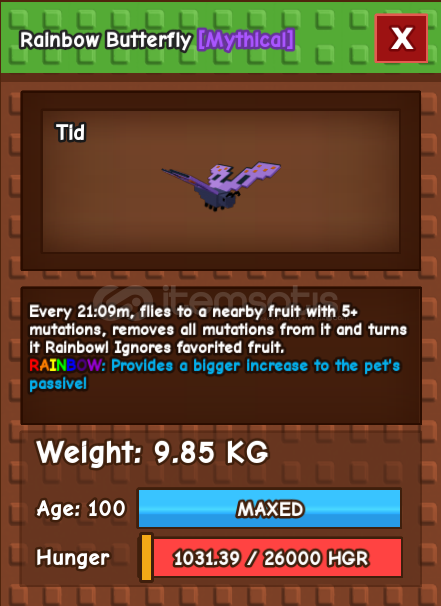 butterfly oldukça nadir bir pettir yüzde 1 şanşla anti bee egg den çıkmaktadır ve rainbow mutasyonu oldukça onu dahada nadir yapıyor yüzde 3 şanşla çıkan bir şey oldugu için dahada nadir yapıyor ve oyun içinde offeriniz varsa dm den sunarbilirsiniz