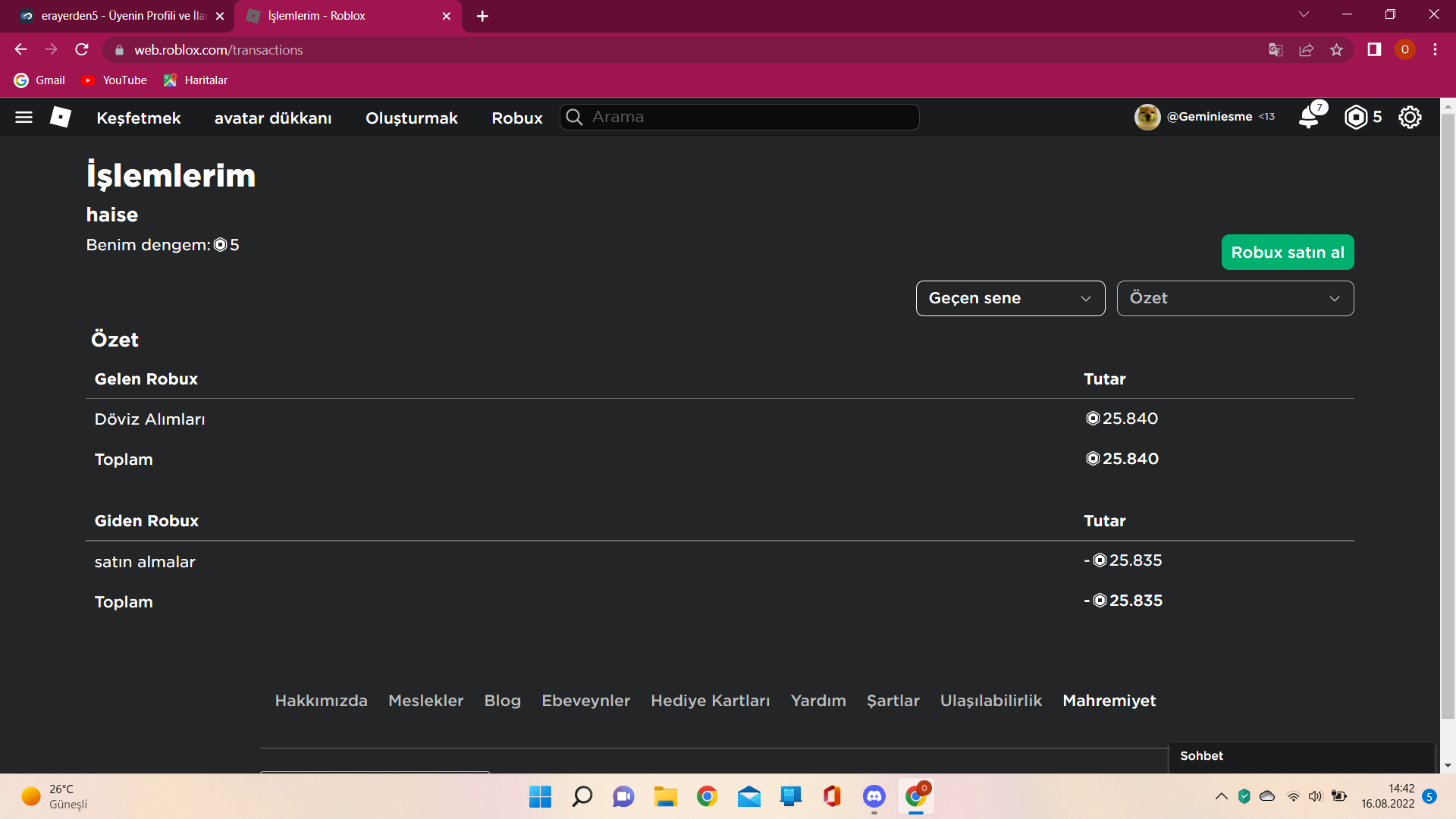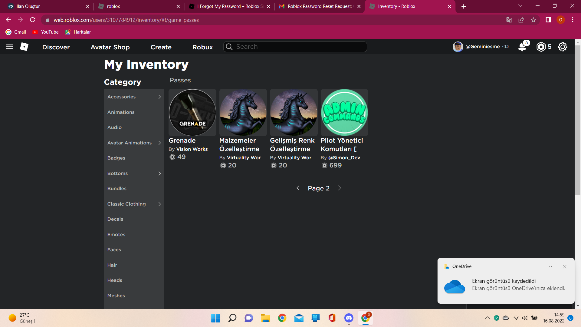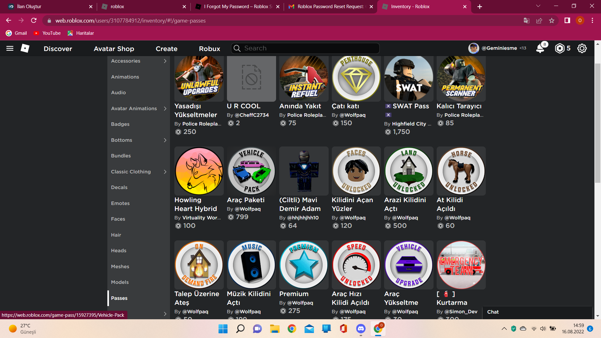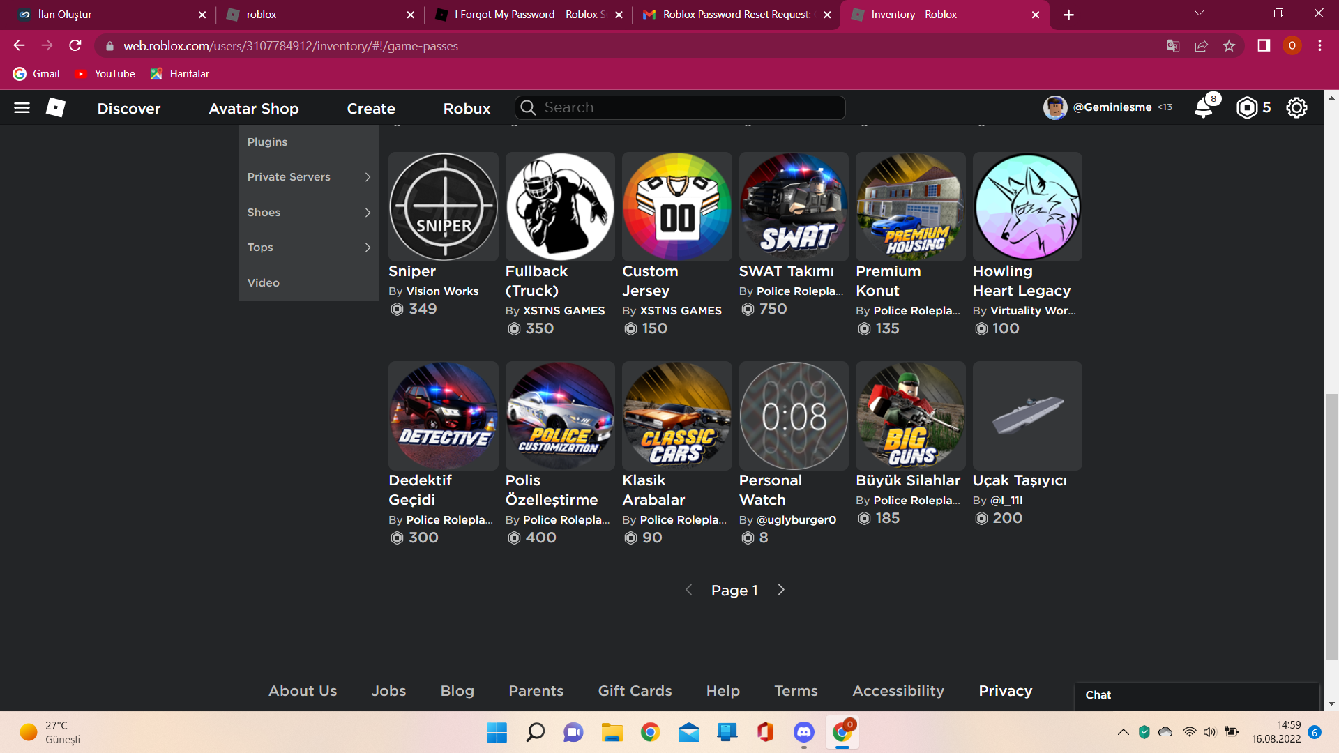 öncelikle hesabın totali 25k dır hesabın içinde şunlar vardır( brokhaveanda gamepasslar fulldur sadece 2 tane game pass yoktur) (bloxburg açıktır) ( hesabın adı geminiesme gidip inventory bakabilirsiniz) ( almak istiyorsanız aktif olmamı bekleyin :) !hesabı aldıktan sonra sorumluluk size geçer! !iade kesinlikle yoktur!