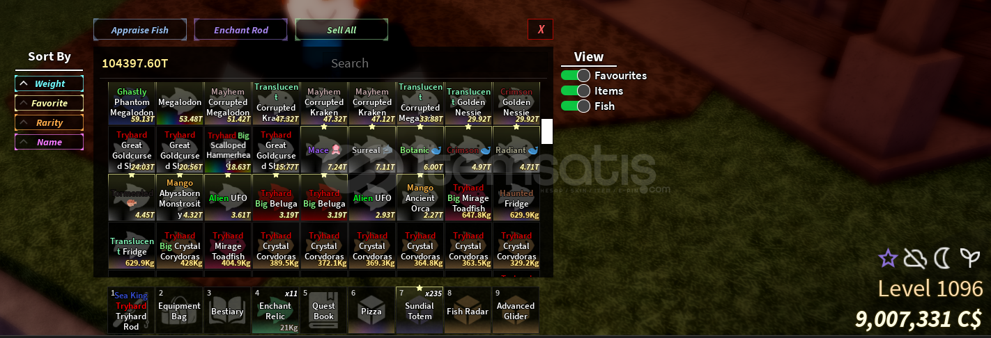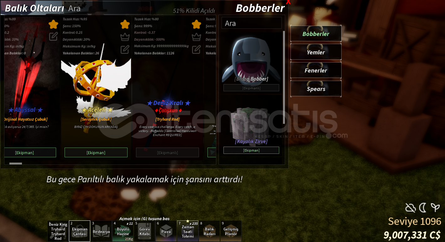Hesap İçeriği;Hesabım 1096 Level 9M Coindir.Try Hard Rod, Serpahic Rod, orjinal No Life Rod , Cerculean Fang Rod, Vampiric Fang Rod , Great Rod Of Oscar , Great Rod Of Dream , Rod Of the Depths , Kraken Rod , Zeus Rod , The Boom Ball , Trident Rod , Tempest Rod , Scarlet Spincaster Rod , Luminescent Oath Rod Ve Bir Çok Rod Oyundaki Rodların %51 İ Açılmıştır.Hesapta Saatlik 1.5m Coin 186k Xp Veren Akvaryum Mevcuttur. Kolayca Afk Ka...