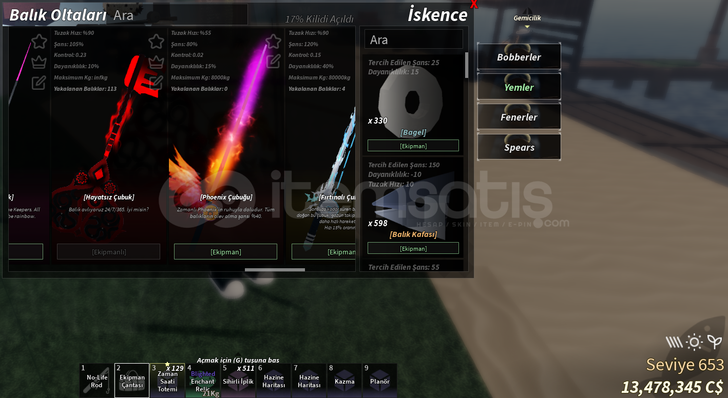 Hesabım 653 Seviyedir İçinde Bir Çok Kaliteli Olta Bulunmaktadır.