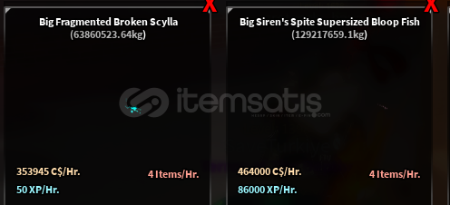 İçinde big fragmented golden scylla 300K VE ORDAKİ BLOOP FİSH 464K toplam 800k saatlik balıklardır.