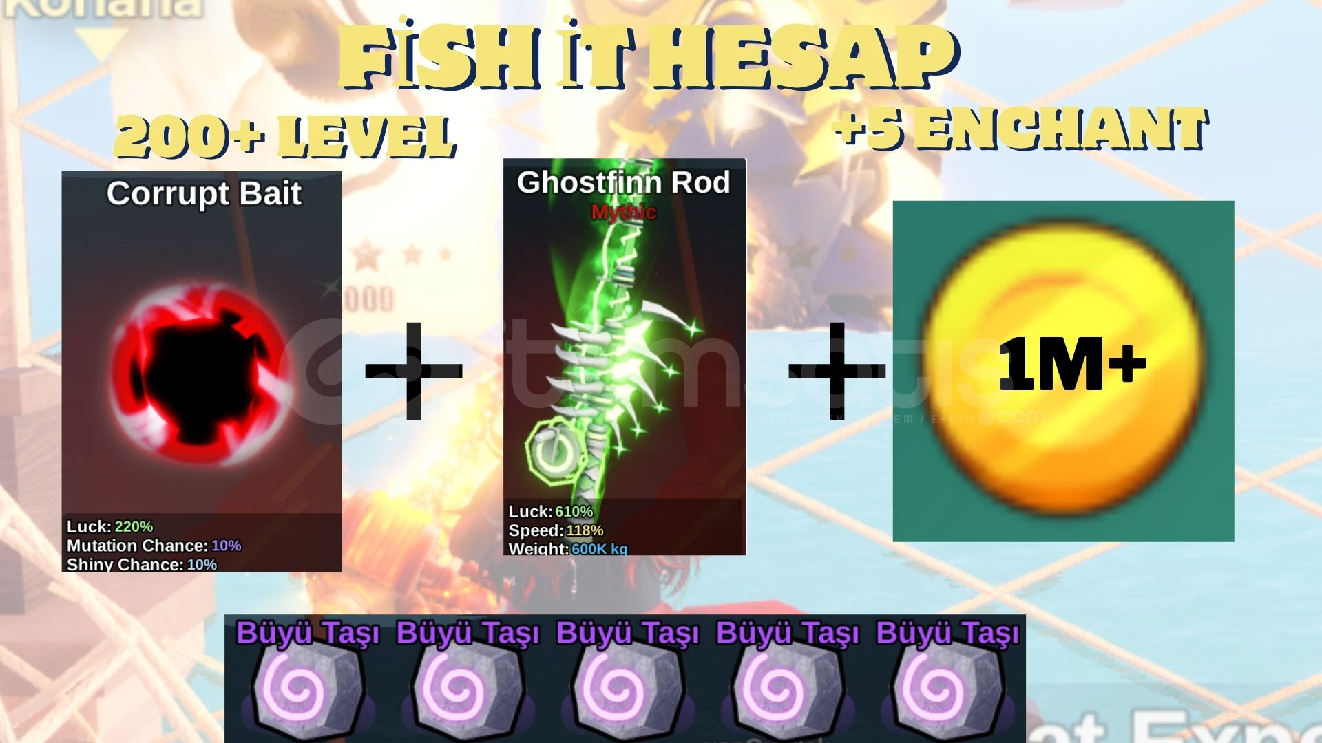 MAİL DEĞİŞENDİRHESAPLARIMIZIN HEPSİNDE AYNI İÇERİK MEVCUTTURHESAP İÇERİĞİ200LVL+ SEVİYEDİRGHOSTFİNN ROD VARDIRCORRUPT BAİT VARDIRHALİ HAZIRDA MEVCUT OLAN 1M+ COİN VARDIR5 ADET ENCHANT STONE MEVCUTTUR