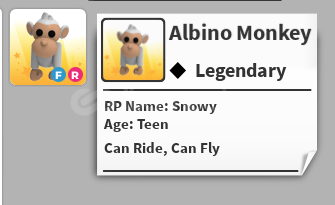 Adopt Me oyununda FR Albino Monkey,Oyun içi trade ile teslim edilir,Diğer ilanlarıma da göz atmayı unutmayınız.