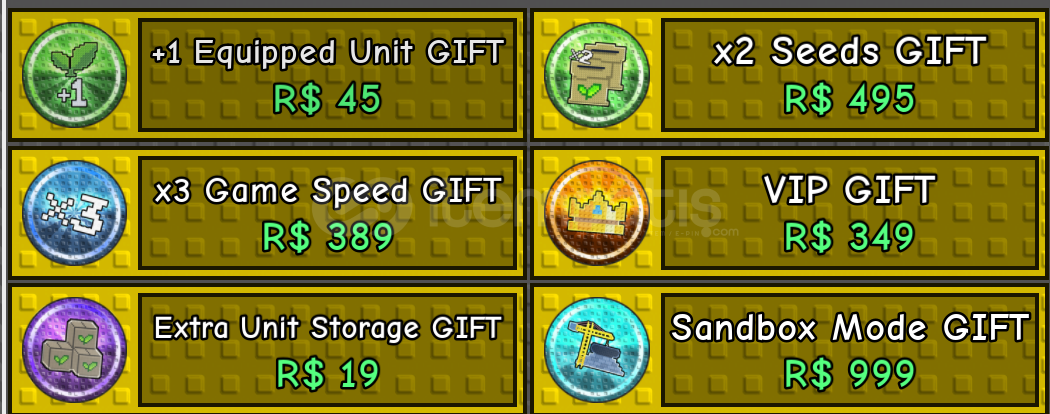x2 Seeds / +1 Equipped Unit / x3 Game Speed / Extra Unit Storage / VIP / Sandbox Mode