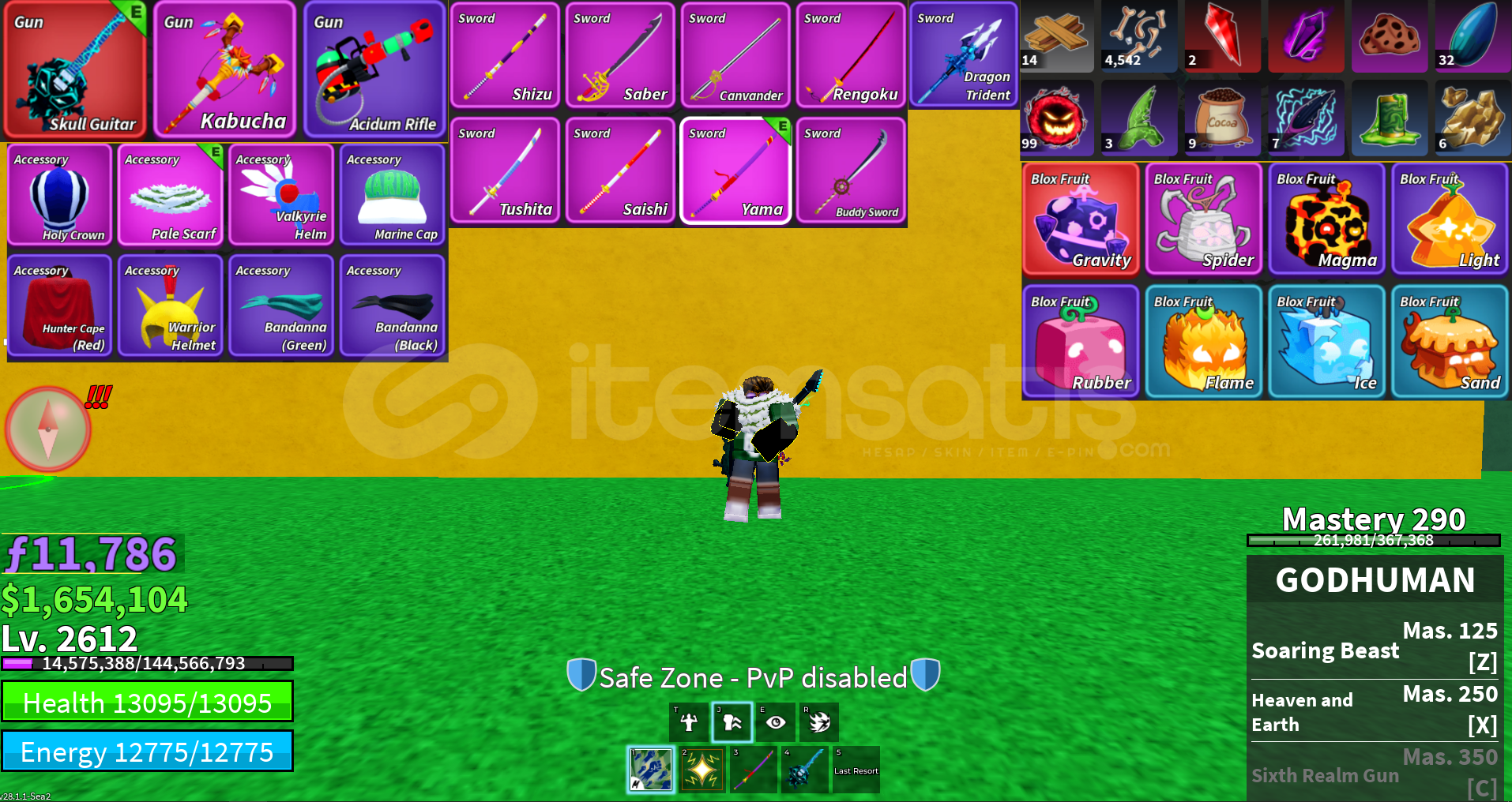 hesap ismi:ReeceSites_183hesapta 1.6m para ve 11k frag vardırkılıçlar:shizu,saber,canvander,rengoku,dragon trident,tushita,saishi,yama,buddy sword.kılıçların çoğunda mastery kasılmıstırsilahlar:skull guitar,kabucha,Acidum Riflesilahlara mastery kasılmamıstıraksesurlar:holy crown,pale scraf,valkyrie helm,hunter cape,warrior helmet.friutler:Gravity,Spider,Magma,Light,Rubber,Flame,Ice,Sand32 tane levi pulu vard...
