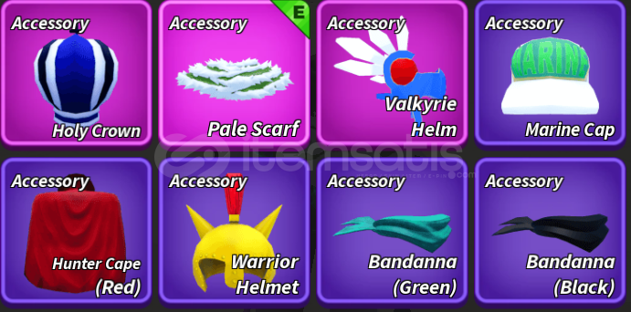aksesurlar:holy crown,pale scraf,valkyrie helm,hunter cape,warrior helmet.