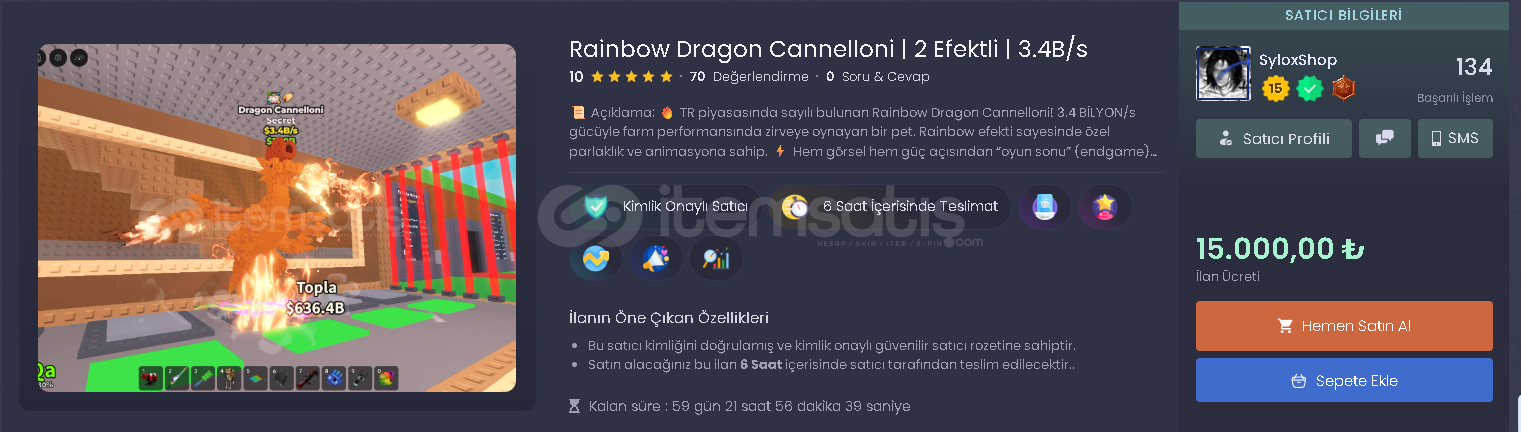 • Satın alacağınız bu ilan 3 Saat içerisinde satıcı tarafından teslim edilecektir..