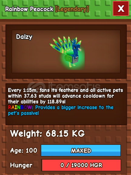 Grow A Garden Huge Rainbow PeacockÖzelliği alan içindeki petlerin cooldownunu düşürmekAlmadan önce lütfen yazınız en kısa zamanda döneceğim.