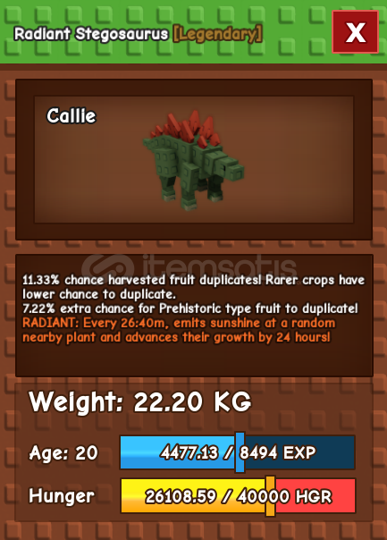 -Şu anlık elimde Huge/Titanic Radiant Stegosaurus'dan yalnızca 1 tane bulunmaktadır.-Yeteneğiyle topladığınız bitkileri duplicate etme yani 2 kere alabilme ihtimaliniz bulunmaktadır.-Gift yoluyla teslim edilecektir.-Fiyat özel olarak hazırlanmıştır. Baz alındığı durumlar; boyutu, değeri, istenme durumu ve kazanmış olduğu mutasyon yeteneği.-Kilosu anlık olarak 22.20 ya...