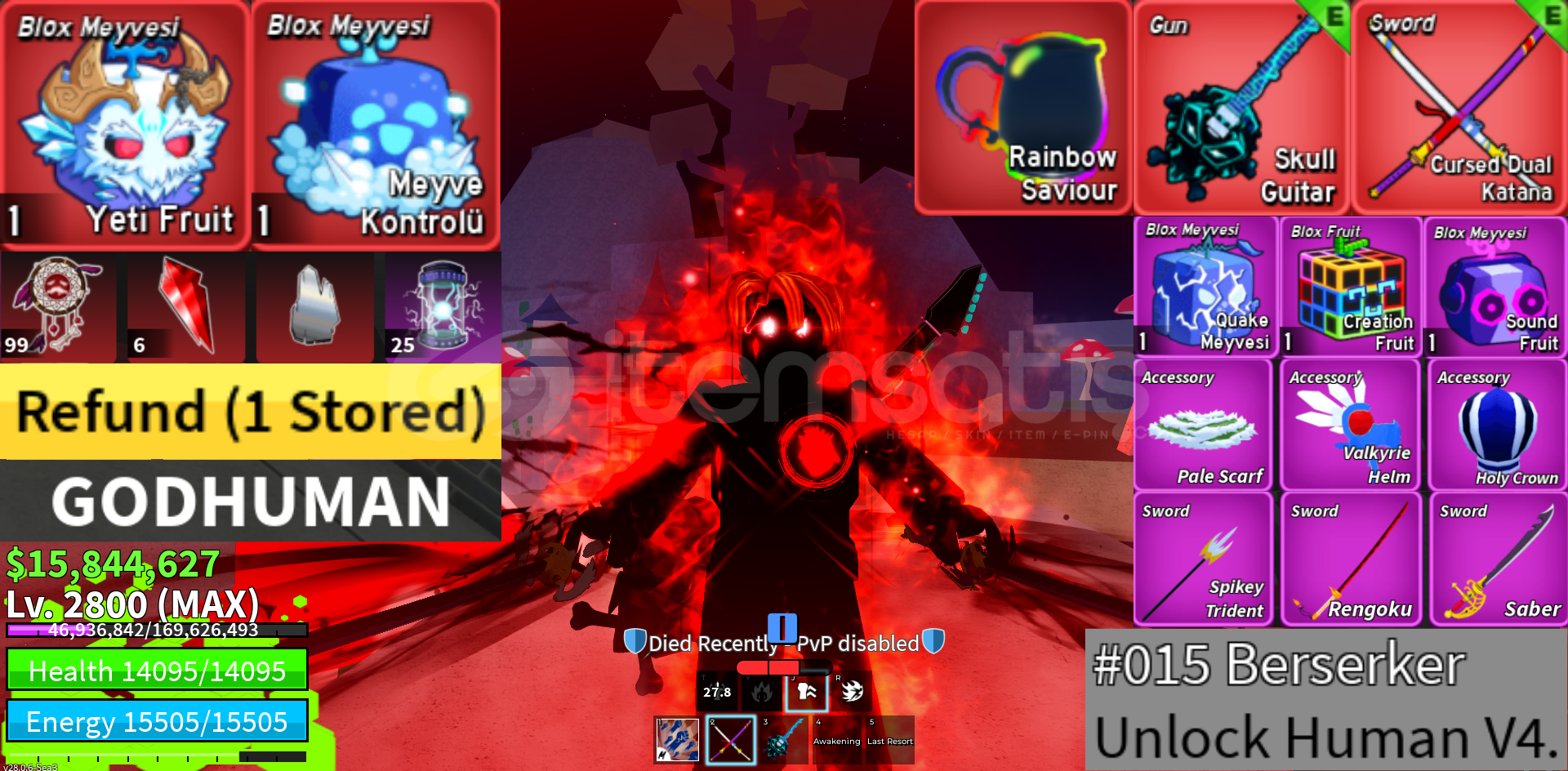 ✅HUMAN V4 FULL GEAR+CDK+SG+GH+RS+1 MYTH✅Hesap Özellikleri ( Blox Fruits ) :✅Hesapta Human V4 Full Gear Vardır.✅Max Leveldir.✅Godhuman Vardır.✅CDK Vardır.✅Skull Guitar Vardır.✅İnventoryde Kontrol ve Yeti Vardır.✅Rainbow Saviour Vardır.✅25M Para Vardır.✅Dough King Kesilmiştir.✅Rip İndra Kesilmiştir.✅Terror Shark Kesilmiştir.✅Hesapta Gmail Bağ...
