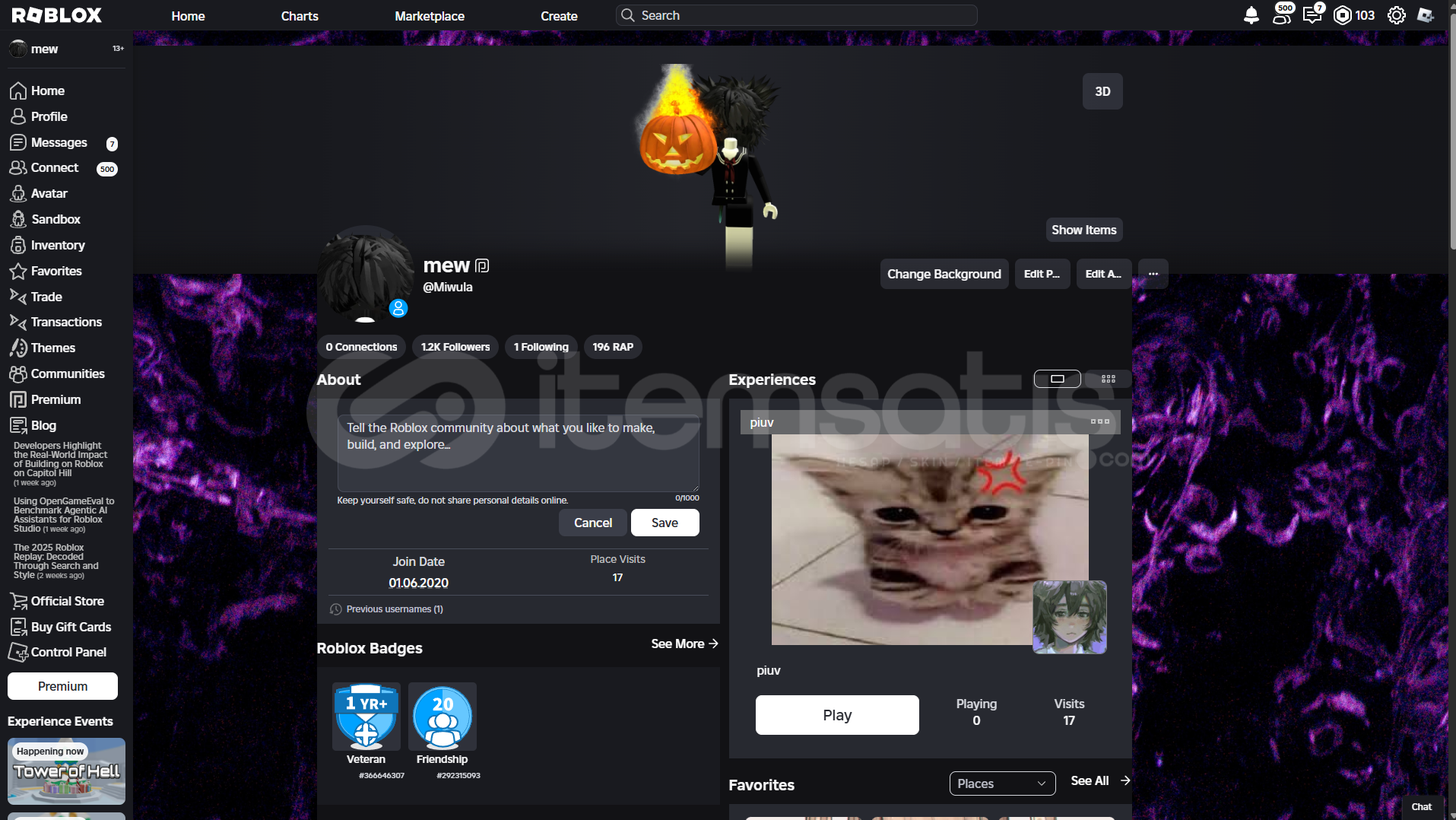 Main hesabımdır. Farklı bir hesaba geçtiğim ve artık aktif olarak kullanmadığım için satmak istiyorum.Youtube'da 9m aboneli kanal olan Foltyn'in roblox hesabı takip ediyor. Joinleri açmayın sürekli birileri joinleniyor foltyn takip ettiği için :DDDHesap tamamen bana aittir.Headless korblox mevcut ve 53k totali var.Hesabı mail ile vereceğim.Adopt me ve The strongest battlegroundstan banı var.Hes...