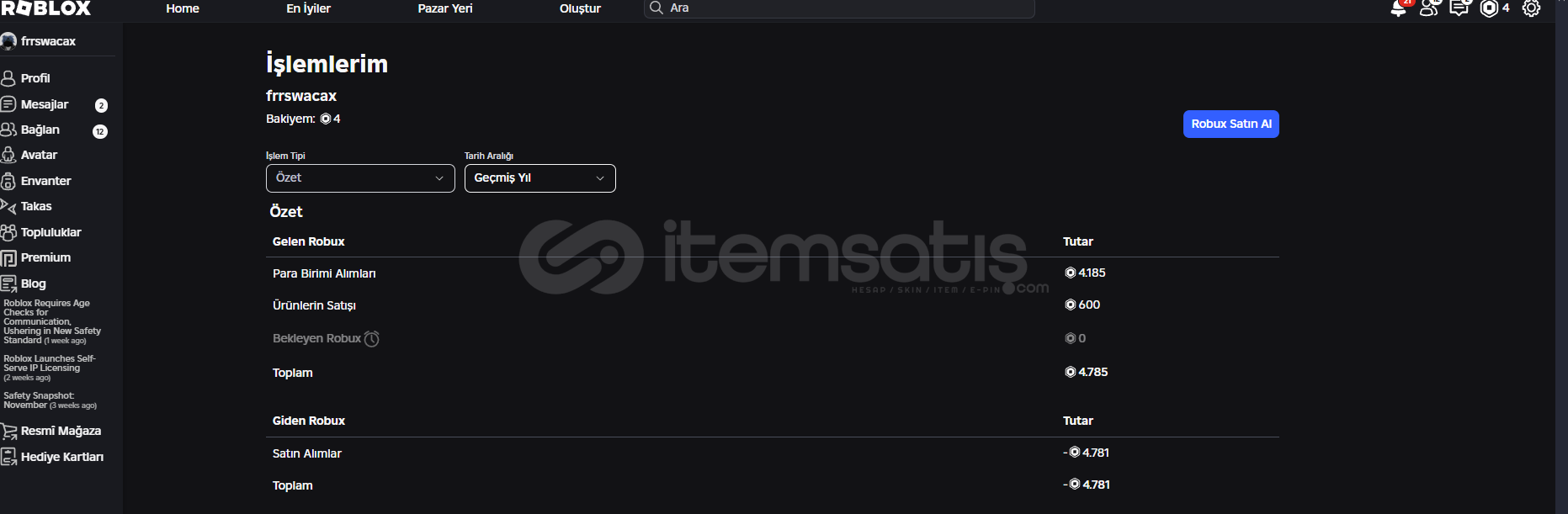 hesaba total 4785 robux yatırılmıştır