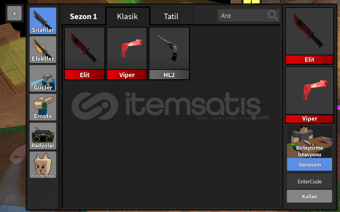 Viper silahı evsanevi bir silahtır.Elite bıçağı evsanevi bir bıçaktır.-Ekstra 1 tane nadir silah veya bıçak verilecektir herşey elden.-En ucuz fiyattan en güvenli şekilde satışa sunuyoruz.-Çekinmeden ilanlar ile alakalı her sorunuzu bana sorabilirsiniz.-En iyi güvenlik.-silahı ve bıçak görselde gösterilmiştir.
