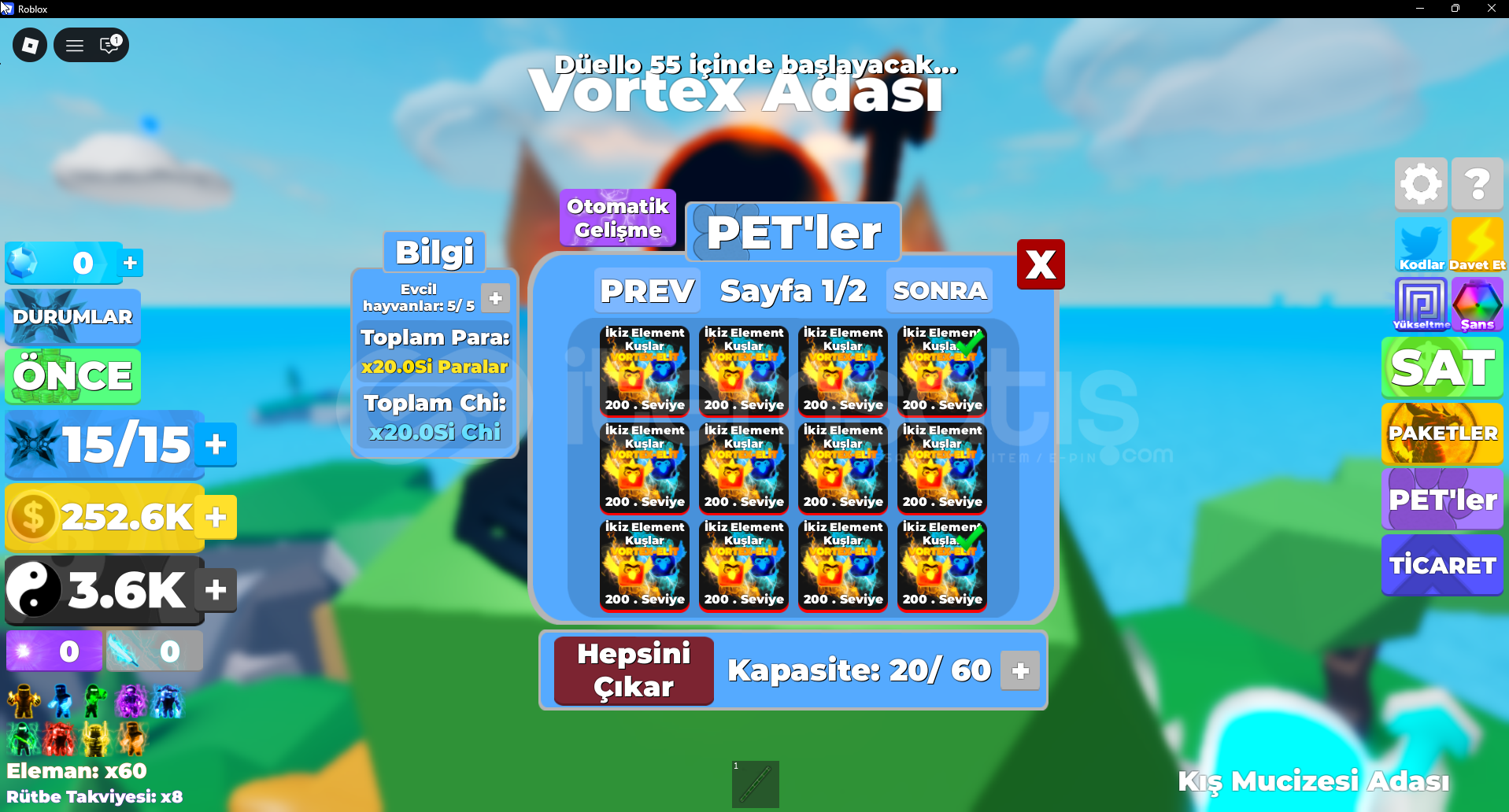 BU İLANI ALDIĞINIZ'DA BÜTÜN MASTERLAR AÇIK VE SON ADA(VORTEX) ADASI AÇIK BİR HESAP SİZE VERİLECEKTİR.HESABIN BÜTÜN BİLGİLERİ DEĞİŞMEKTEDİRNİNJA LEGENDS 5K TRADE BANI AÇIKTIR VE 60 PET TAŞIMA KAPASİTESİ MEVCUTTUR.HESABIN İÇİNDE 20 ADET İKİZ ELEMENT KUŞ BULUNMAKTADIR.