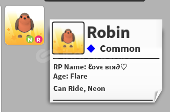 Adopt Me oyununda NR Robin,Oyun içi trade ile teslim edilir,Diğer ilanlarıma da göz atmayı unutmayınız.