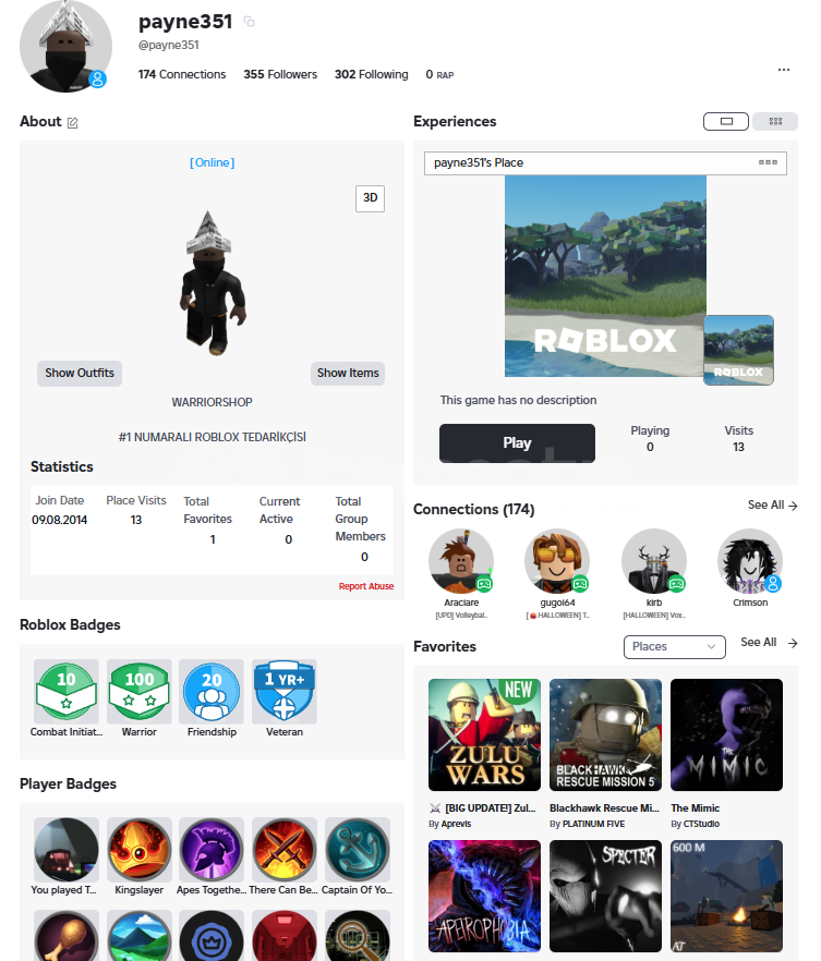 2018'Den beri düzenli oyun geliştiren bir insanım roblox düzenli oynuyorum 7 yıldır. Sitedeki en kaliteli hesap çıktı içinde eski doğrulama ile verilen hediye ve 3400 Robuxluk Limited Şapka çıktı. Teşekkürler warriorshop!