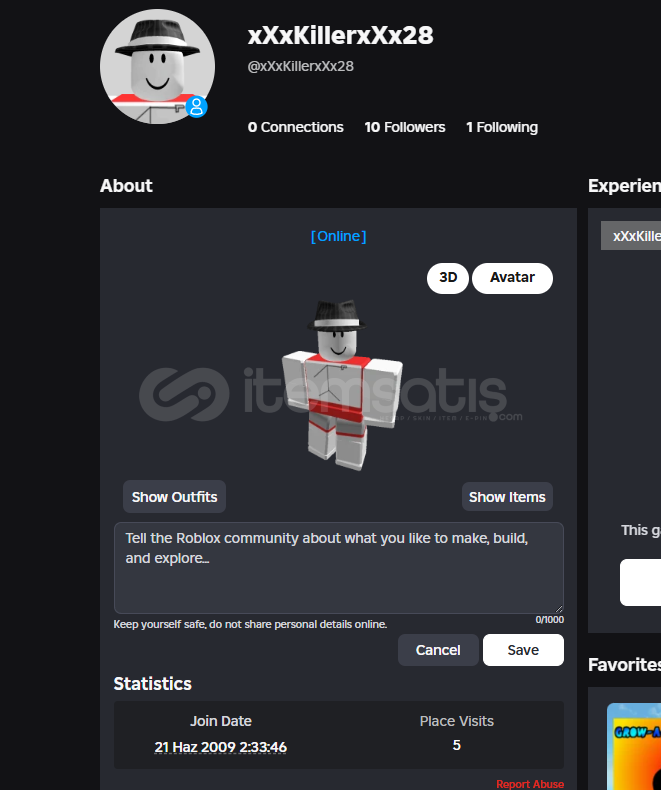 Hesapta 4500 Robux değerinde Perfectly legitimate business hat vardırLimitedı satarak robuxa çevirebilirsiniz.Hesap onaysızdır onaylayan ilk mail sahibi siz olacaksınız geri çekilme ihtimali vb bu yüzden imkansızdır.Hesap ismi xXxKillerxXx28Hesap 2009 kurulumdurHesapta ayrıca 1 adet offsale vardırPazarlık az miktarda olur yazmanız yeterli