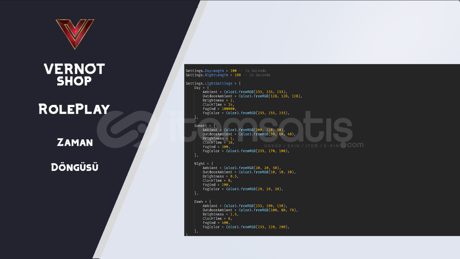 💠 Özellikler: ☀️ Gün & Gece Süresi Ayarı: Gün ve gecenin uzunluğunu tamamen özelleştir! 🌅 Özel Işık Ayarları: Gün, gün batımı, gece ve şafak için kişiselleştirilebilir ışık efektleri. 🕹️ Esnek ve Kullanıcı Dostu: Döngüyü oyununa göre kolayca yapılandır, roleplay deneyimini üst seviyeye taş...