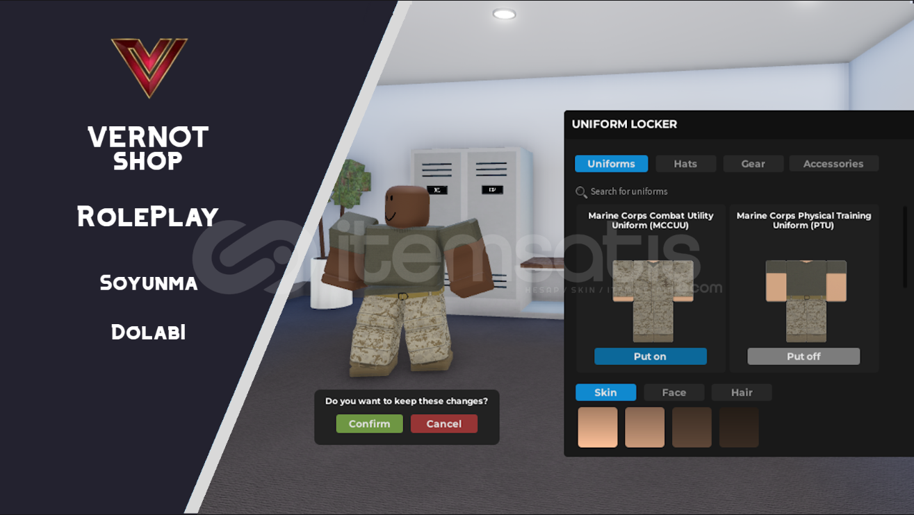 💠 Özellikler:👤 Tam Karakter Özelleştirme: Yüz, saç, ten rengi, üniforma, şapka, ekipman ve aksesuarları seç!📦 Çoklu Dolap Tipleri: Farklı takım veya grup izinlerine göre dolaplar oluşturabilirsin.⚙️ Temiz Karakter Başlangıcı: Sistem, Roblox T-Shirt ve diğer tüm aksesuarları kaldırarak temel karakter oluşturur, dolapta kolayca özelleşti...