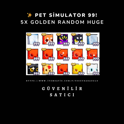 İlan Açıklaması✨ Pet Simulator 99!10 Adet GOLDEN Random Huge PetSatın alımdan sonra kullanıcı adınızı iletmeniz yeterli.Oyun için trade yada posta yoluyla teslim edilir.Siparişleriniz hızlı bir şekilde teslim edilir.➤yusufkaraoglu © Since 2021