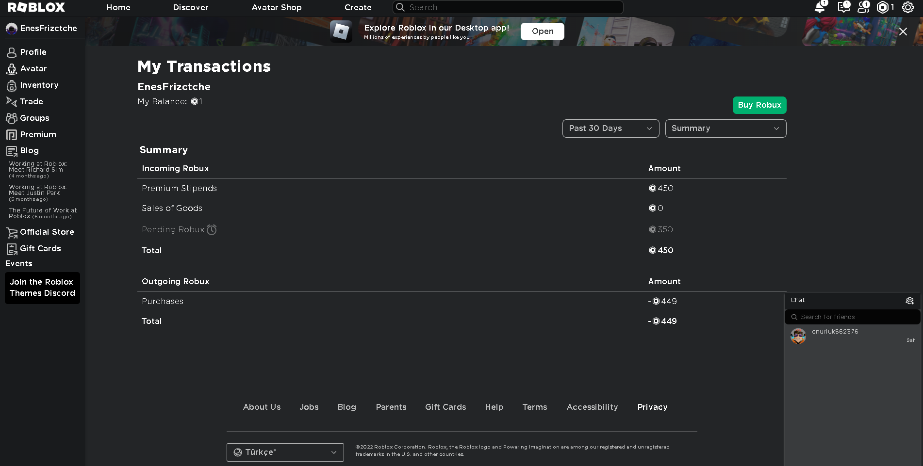 Hesap 350 pending robux vardır 2 gün sonra robux gelir.preimum vardır daha 1 hafta bile olmamıştır.800 totaldir.Ninja legendsda aşırı kasılmıştır.Tower battlesta özel karakterler vardır.İçinde raven hood vardır.1 tane grubu vardır.