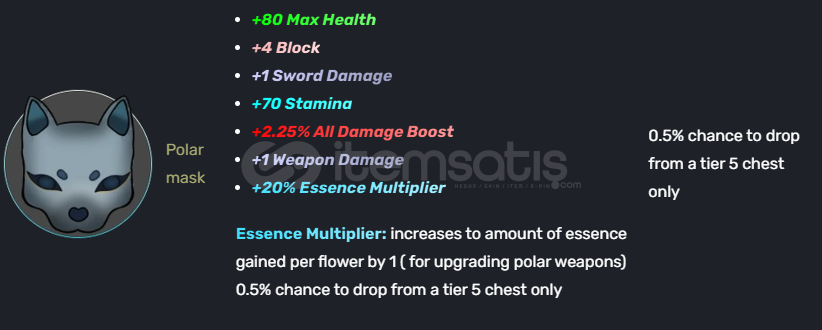 +80 Maksimum Sağlık+4 Blok+1 Kılıç Hasarı+70 Dayanıklılık+2,25% Tüm Hasar Artışı+1 Silah Hasarı+20% Öz ÇarpanıÖz Çarpanı: Çiçek başına kazanılan öz miktarını 1 artırır (kutup silahlarını yükseltmek için) Sadece 5. kademe sandıktan düşme şansı %0,5Sadece 5. kademe sandıktan dü&#...