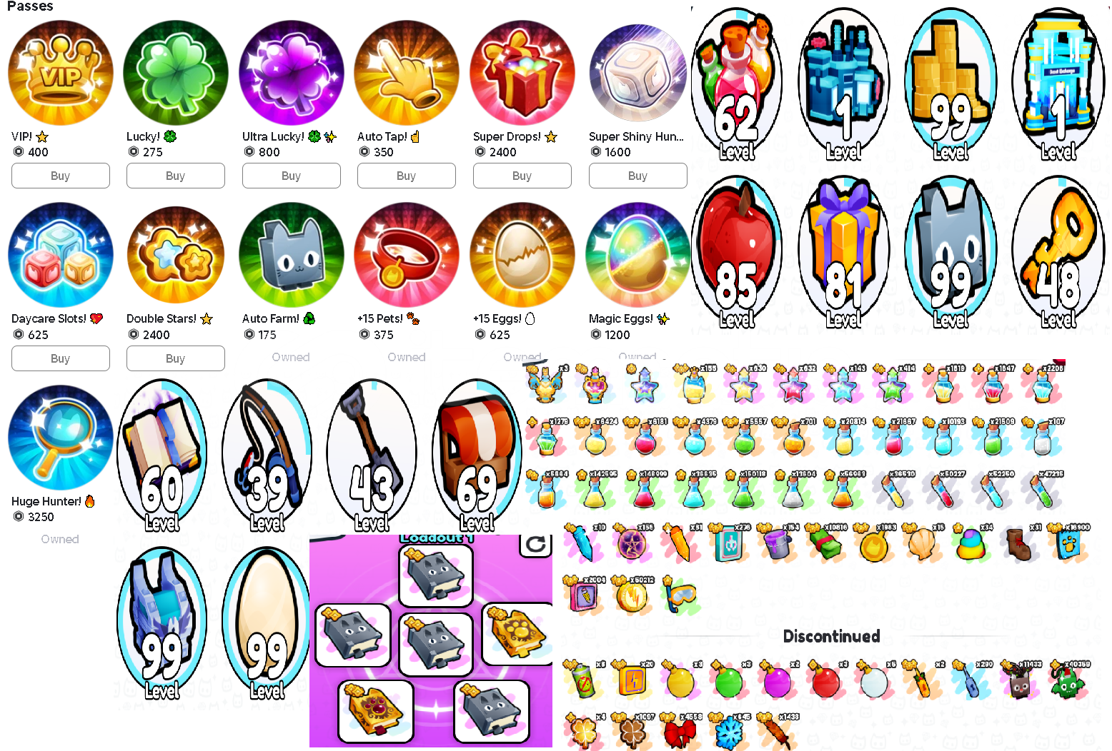 Pet simulator 99Hesap içeriği:34 MAX RANK eşi benzeri yoktur.5625 robux yatırılmıştır.İÇERİK GÖRSELDEKİ GİBİDİR SATIN ALMADAN ÖNCE MESAJ ATINIZ5625 ROBUX YATIRILMIŞTIR GÖRSELDEKİ HERŞEY EKSİKSİZ VARDIR.!!!OYUNCANAVARI GÜVENCESİYLE.