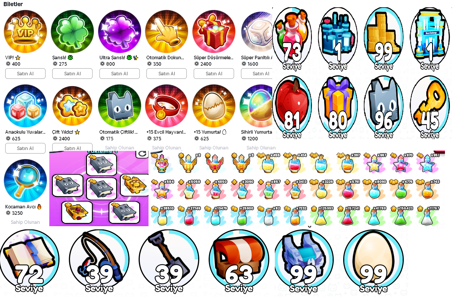 Pet simulator 99Hesap içeriği:34 MAX RANK eşi benzeri yoktur.5625 robux yatırılmıştır.İÇERİK GÖRSELDEKİ GİBİDİR SATIN ALMADAN ÖNCE MESAJ ATINIZ5625 ROBUX YATIRILMIŞTIR GÖRSELDEKİ HERŞEY EKSİKSİZ VARDIR.!!!OYUNCANAVARI GÜVENCESİYLE.