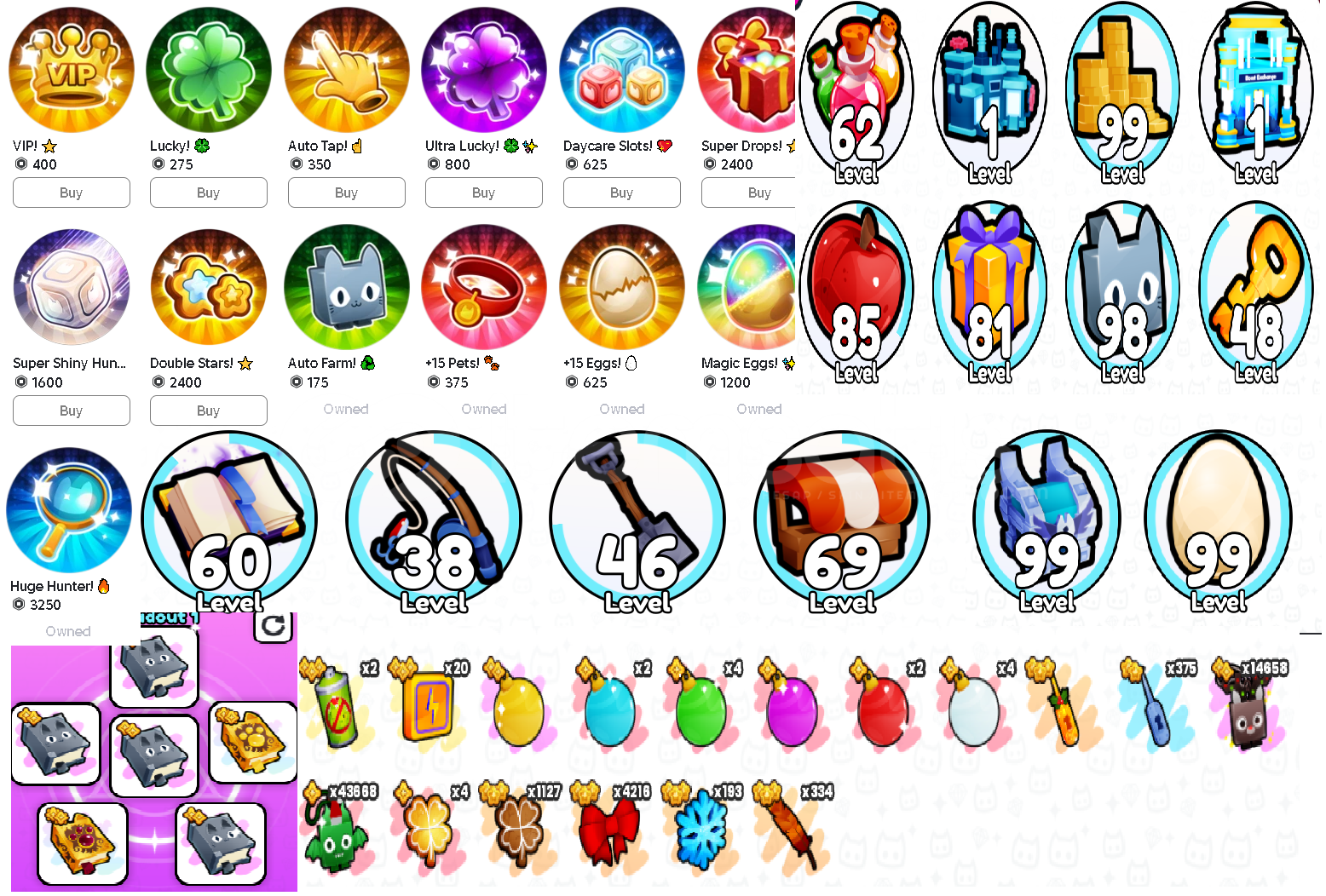 Pet simulator 99Hesap içeriği:34 MAX RANK eşi benzeri yoktur.5625 robux yatırılmıştır.İÇERİK GÖRSELDEKİ GİBİDİR SATIN ALMADAN ÖNCE MESAJ ATINIZ5625 ROBUX YATIRILMIŞTIR GÖRSELDEKİ HERŞEY EKSİKSİZ VARDIR.!!!OYUNCANAVARI GÜVENCESİYLE.
