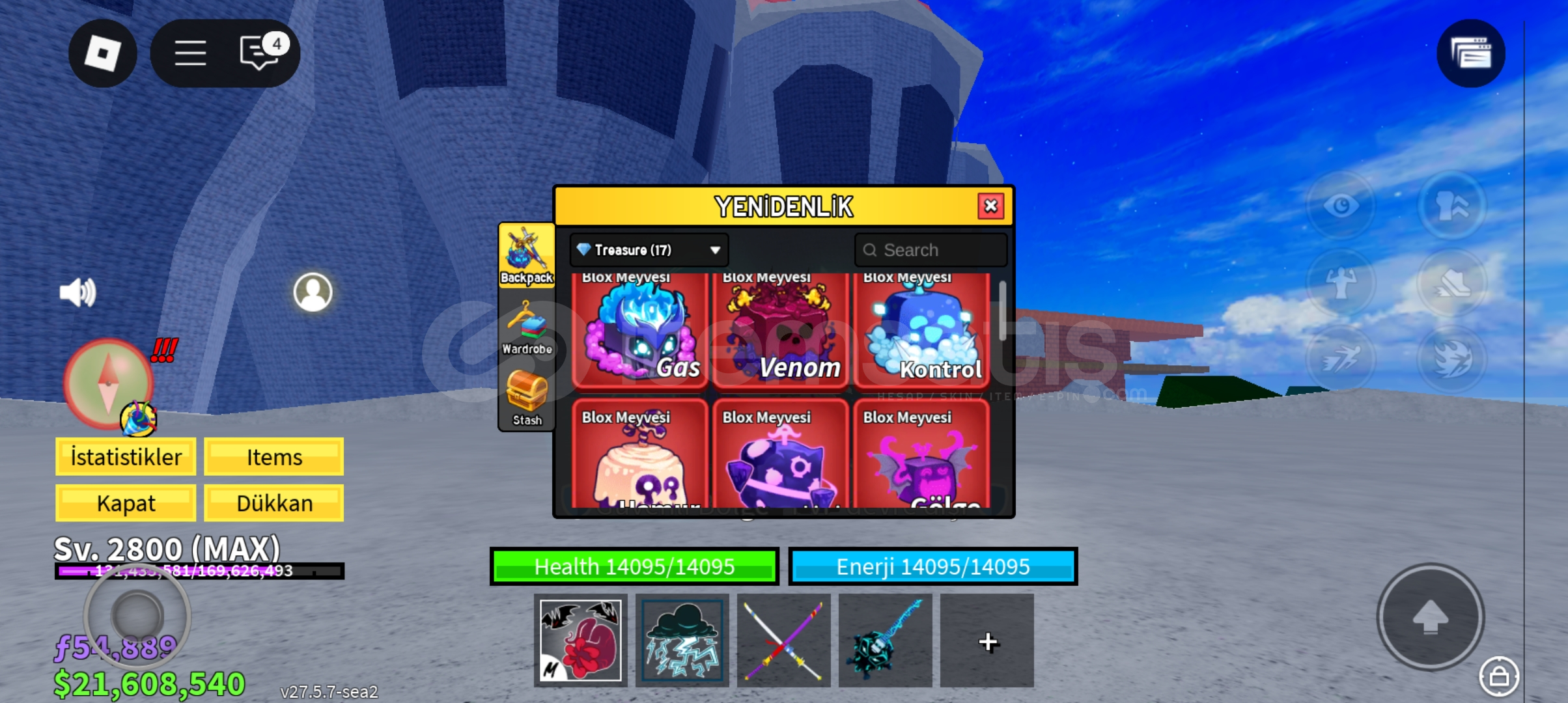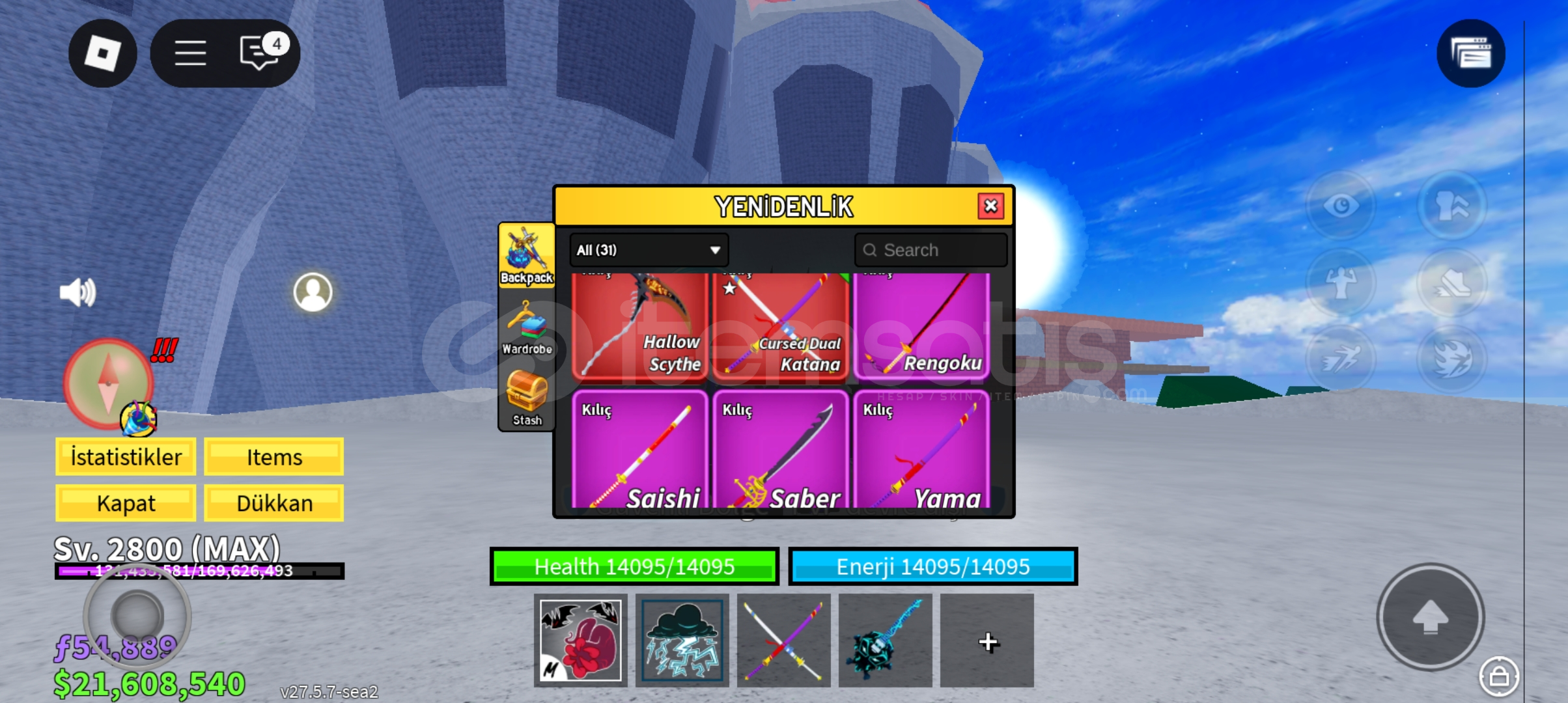Tamamen pvp hesabıdır Hesaptakiler;Sangui art Rumble full v2Dragon talonSkull gitarCdkTtk kılıcının 1/36 efsane mitik fruit 55k frag 22m beli(Frag ve beli miktarı hayla oynandığı icin artışdadır) Hesap hic ban yememiştir ve ozel avatar vardır + kıyafet de vardır hesapta rastgele robux da cıkıyor 10k robux sınırİstediğiniz + bisey varsa hesabı aldıkdan sonra dm atmanı...