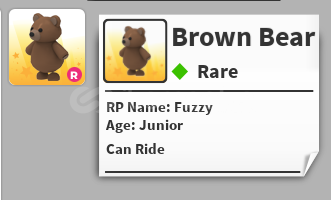Adopt Me oyununda R Brown Bear,Oyun içi trade ile teslim edilir,Diğer ilanlarıma da göz atmayı unutmayınız.
