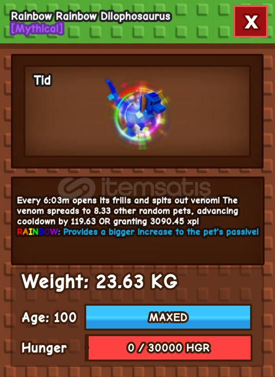 Grow A Garden Rainbow hatched dilophosaurus.Aktif değilsemde alabilirsiniz hemen dönüş yaparım.100 age 23.63Kg