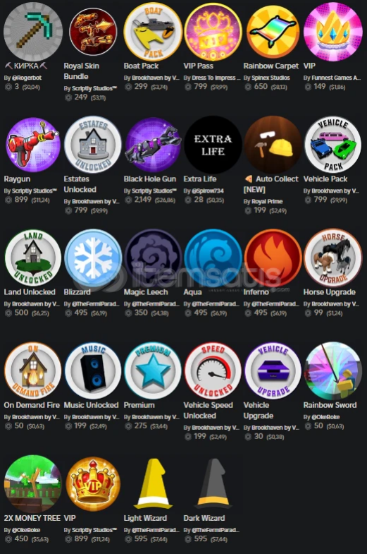 • Çeşitli Gamepassler bulunmaktadır, hesapta sadece gamepass ve 565 robux vardır.