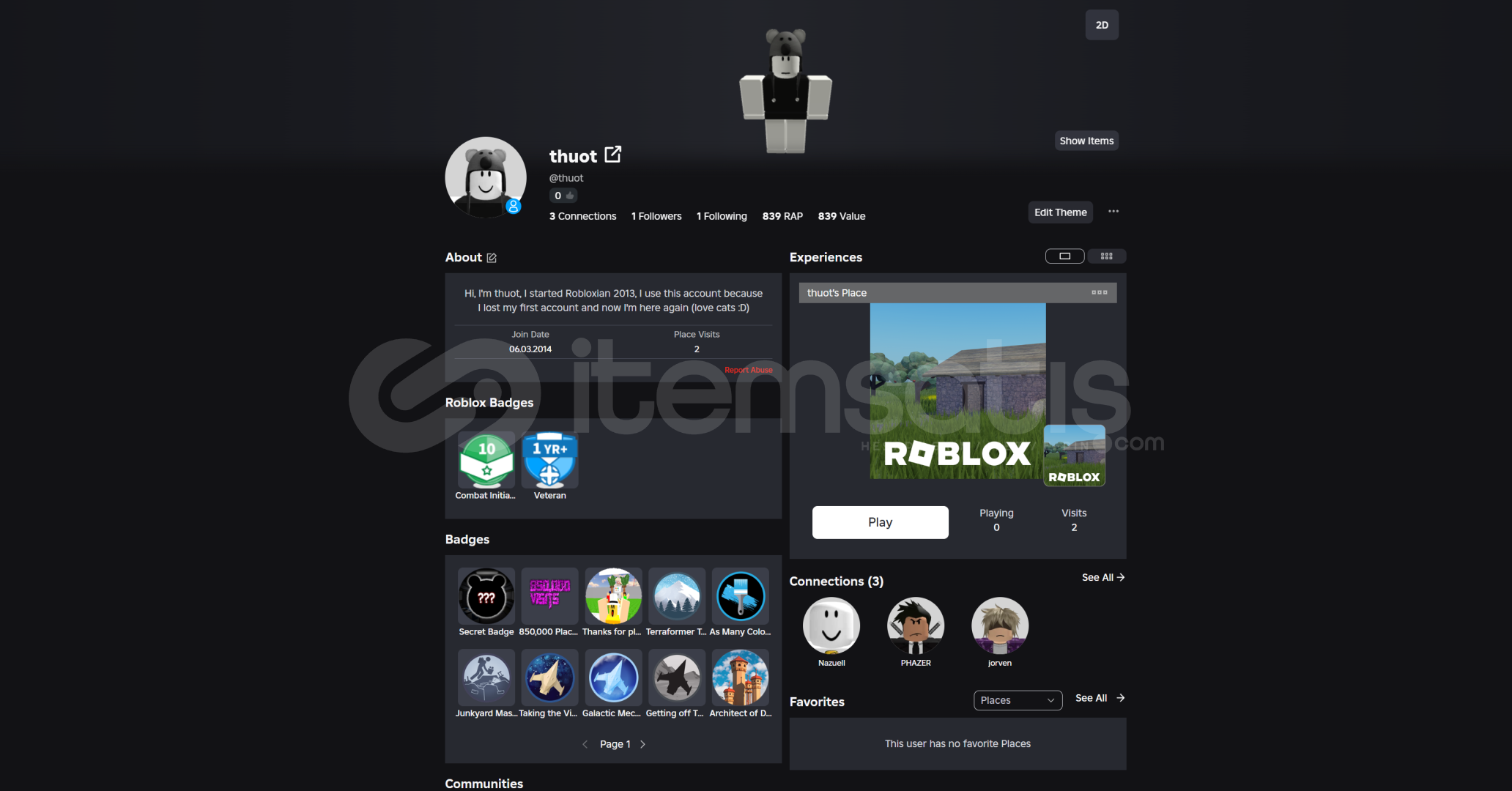 •Hesap ismi: thuot•Hesap profili linki: https://www.roblox.com/users/57105124/profile•Hesap açılım tarihi: 06.03.2014•Hesapta Combat Initiation Badge vardır 2015ten sonra roblox vermemeye başladı hesaba bu da oldukça değer katar. •Kuddle E. Koala vardır hesapta 839 robuxdur değeri•Hesapta tüm event eşyaları vardır bunu kendi emeklerimle yaptım event yapmanıza gerek kalmayacak..•...
