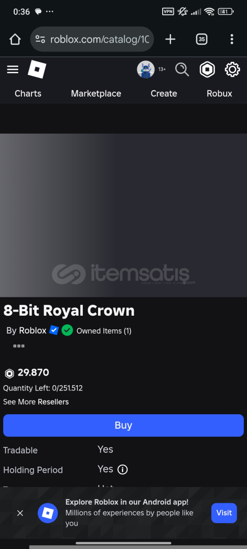 8-Bit Royal Crown adlı İtem satılmaktadır. 👾Pazarlık vardır. 💯🌟Trade yapabilmek için 1 tane ucuz fiyatlı limited eşyanızın ve Roblox Premium Aboneliği izin olması gerekmektedir. 🤝